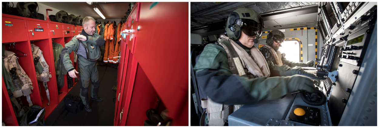 Sensor-operator SGTODOPS Dave (foto links) bereidt zich voor op de onderzeebootjacht. Een ASW-crew bestaat uit 1 of 2 sensor-operators, achterin de helikopter. Zij bedienen de sonar, sonoboeien en analyseren de binnenkomende informatie (foto rechts).