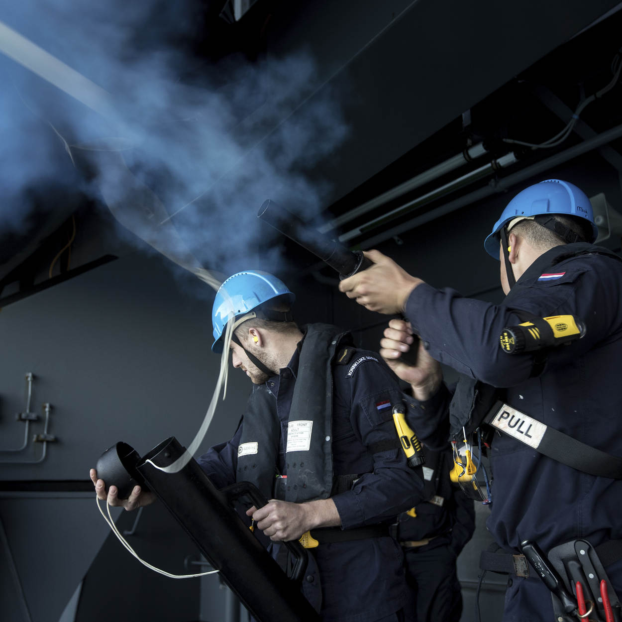 Hoofdaannemer Tuin realiseerde het imposante bouwwerk, samen met een rijtje onderaannemers. Dat scheepsbouwer Damen het scheepsstaal leverde, is geen verrassing. “De opstelling stelt om te beginnen de BOZ-positie voor van Zr. Ms. Karel Doorman”, vertelt luitenant ter zee 2OC John Wennink, Hoofd Zeemanschap. “Via de portaalmast kan het laadstation van een Luchtverdedigings en Commando Fregat (LCF) aan de overkant bevoorraad worden.”