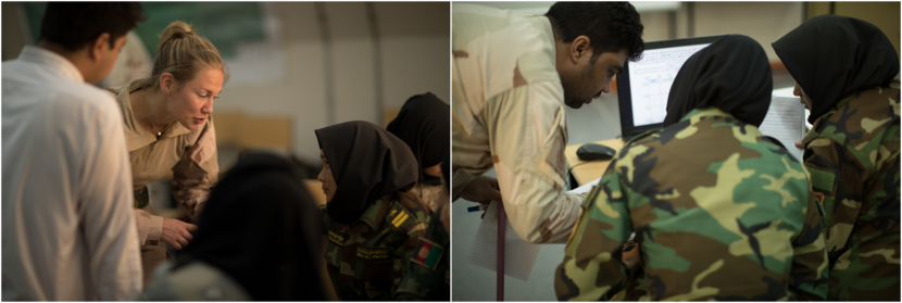 De instructeur loopt samen met Miriam langs de tafeltjes, om te helpen bij de opdrachten. “Met enkel het geven van cursussen dragen we nog niet bij aan professionalisering en acceptie van vrouwen in uniform. Gender is op hoog niveau een belangrijk onderwerp. Daarom adviseren wij gender advisors rechtstreeks generaal Stahl (commandant van de Resolute-Support basis in het noordelijk gelegen Mazar-e-Sharif) over bijvoorbeeld de aanstaande verkiezingen in oktober.”