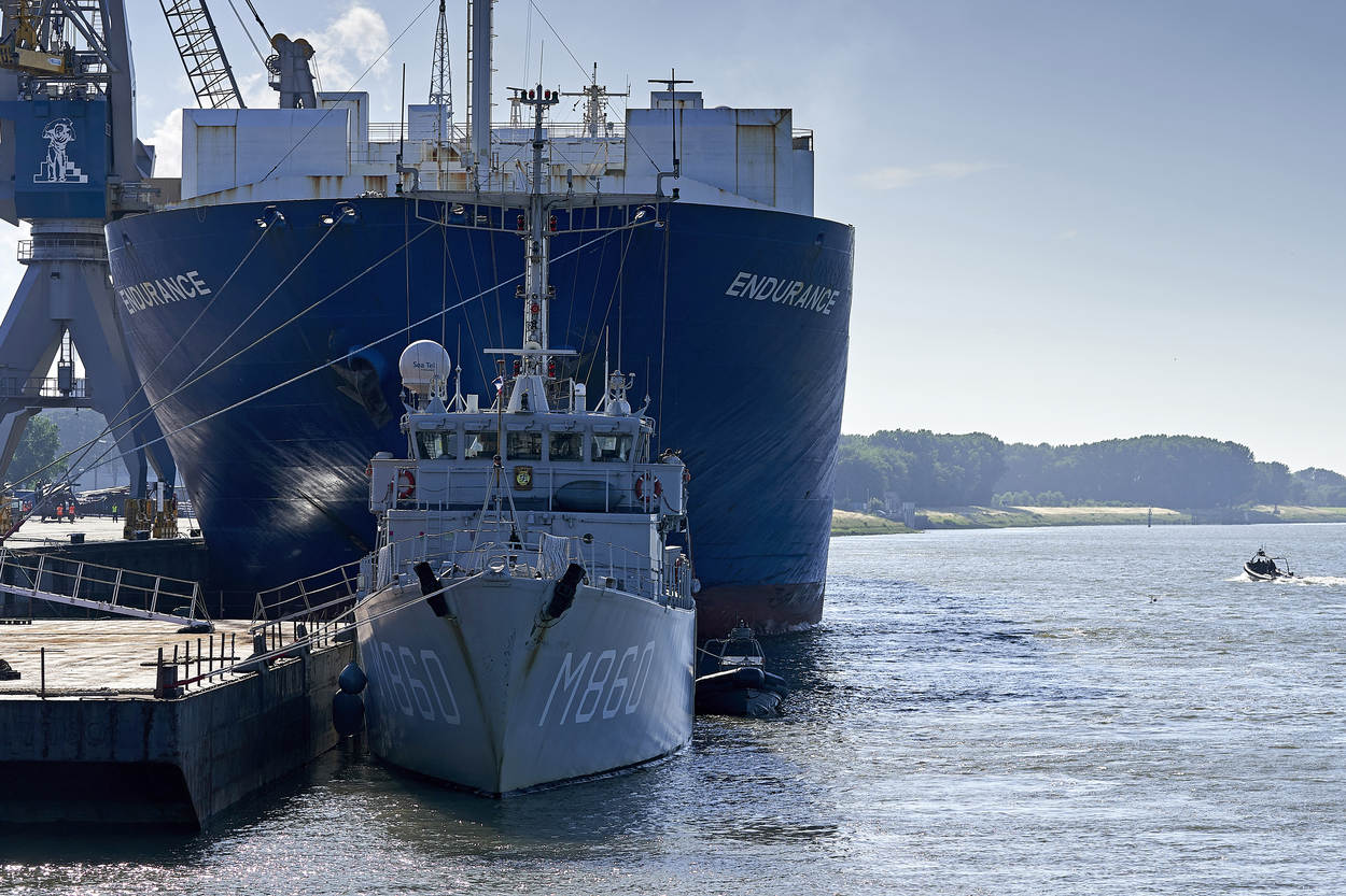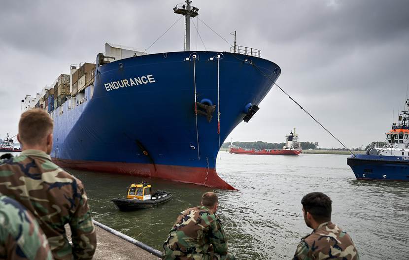 De KM levert daarnaast Force Protection vanaf de waterkant, vanaf het moment dat de Endurance de Nieuwe Waterweg opvaart, tot het moment dat het schip aanlegt. “Vanaf dan, vanwege de meegevoerde specifiek militaire zaken aan boord, is dit havengebied een Tijdelijk Militair Object (TMO)”, legt Van Proosdij uit. “Indien het specifieke materiaal, het ‘groene’ deel, verder op weg is en alleen nog niet-specifiek materieel, het ‘witte’ deel, nog aanwezig is, dan neemt een civiele organisatie de bewaking over. Dan is het geen TMO meer en is de bewaking vanaf de waterzijde ook voorbij.”
