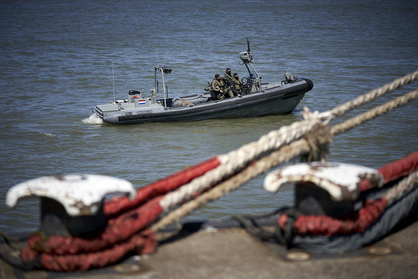 De krijgsmachtdelen hebben ieder zo hun specialiteit. “Die van de KM ligt van oudsher in het maritieme domein, zowel op, in als nabij het water”, stelt luitenant ter zee 1 Corina van Proosdij, normaliter hoofd Nationale Operaties bij de KM. In de Rotterdamse haven is ze hoofd van het maritieme deel van het HNS. “Voorafgaand aan de komst van het schip stellen we het havengebied maritiem veilig. Onderwater zorgt Zr. Ms. Schiedam daarvoor, samen met de Defensie Duikgroep en de Maritieme EOD. Onze Maritime Advanced Search Teams (MAST) doen dat op het water, op de kades en het door Defensie afgezette haventerrein, samen met speurhonden explosieven van de luchtmacht.”