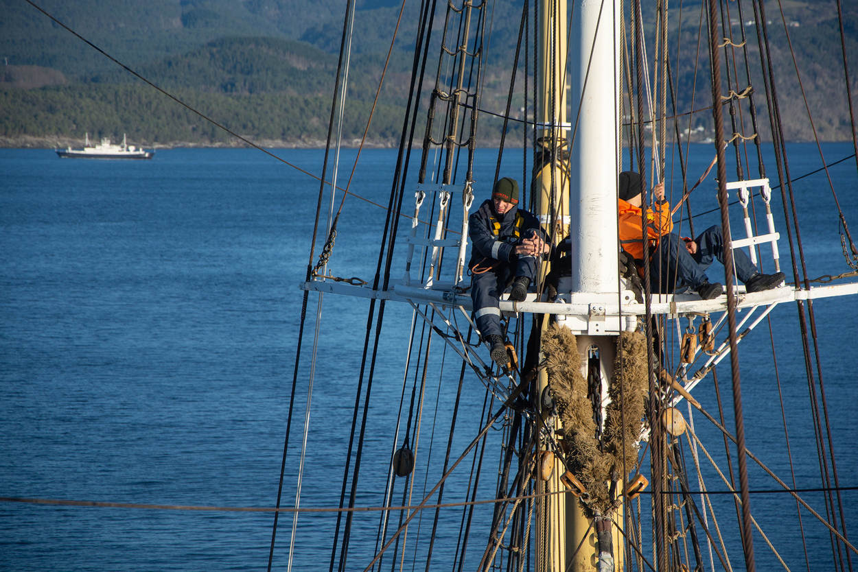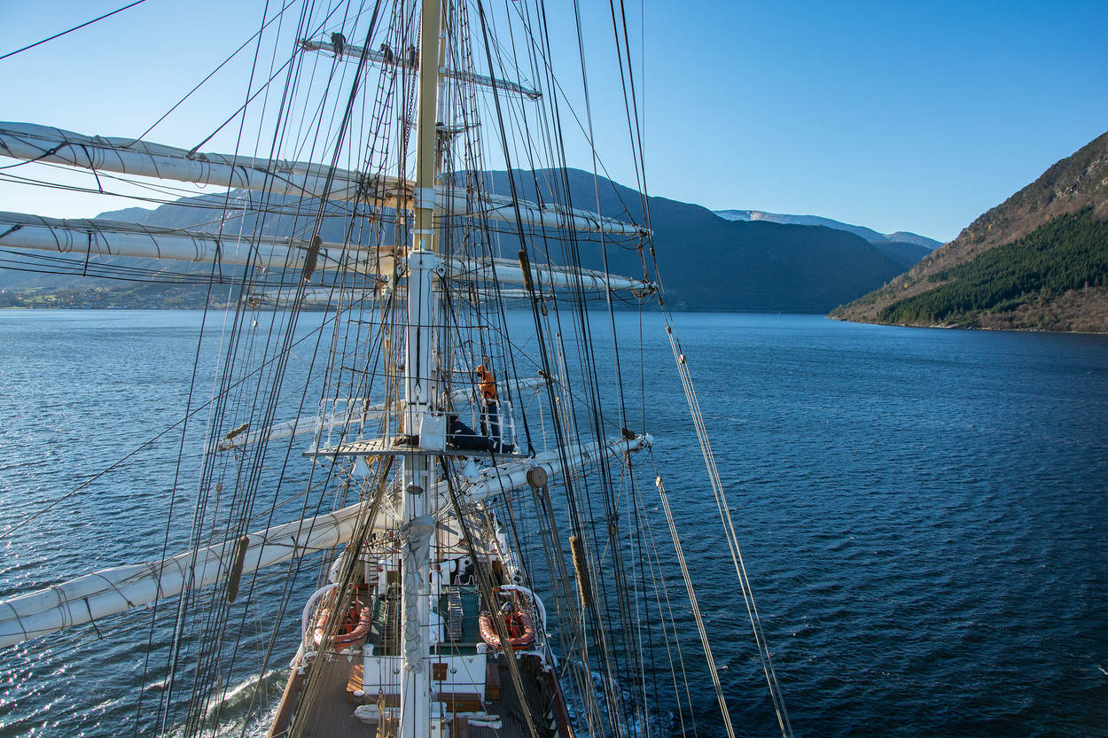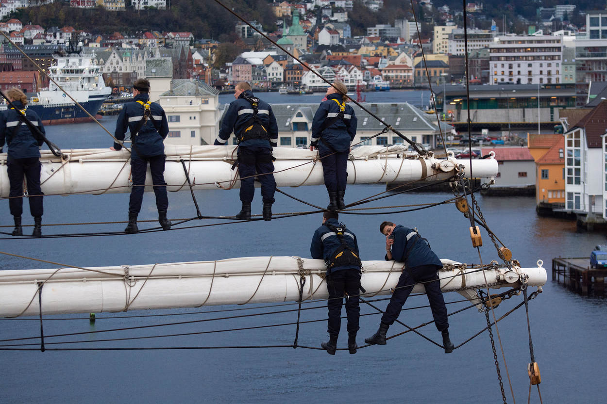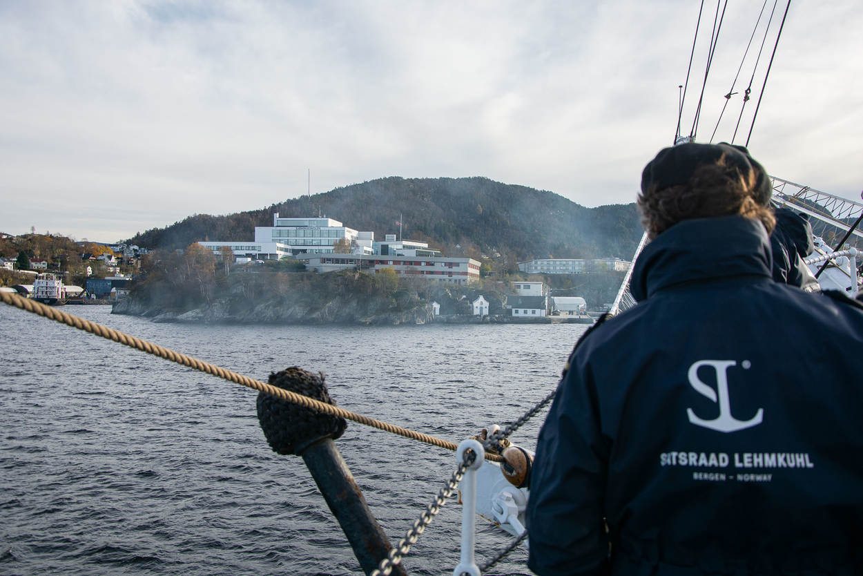 De terugreis verliep redelijk soepel, de wind stond gunstig en in een aardig tempo voer de oude driemaster op Noorwegen af. Voordat de Lehmkuhl aankwam in Bergen, voer het schip eerst door prachtige fjorden en maakte het een tussenstop bij de Sjøkrigsskolen. Deze Noorse marine-academie in Laksevag is praktisch een zusterschool van het KIM. De adelborsten kregen hier de kans om Noorse collega’s te leren kennen. Ook konden ze ervaren welke verschillen, maar vooral overeenkomsten er tussen de 2 opleidingsinstituten bestaan. Zo varen Noorse officieren in opleiding bijvoorbeeld standaard 3 maanden mee met de Statsraad Lehmkuhl, als onderdeel van hun opleiding.
