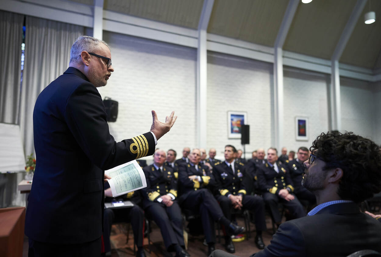 Het panel, gevormd door C-ZSK vice-admiraal Rob Kramer, generaal-majoor Frank van Sprang, vice-admiraal Ben Bekkering en professor dr. Bob de Wit (hoogleraar Strategisch Leiderschap), luisterde aandachtig naar de presentaties. Ook ‘toehoorders’, commandeur Huub Hulsker (COMNLMARFOR) en brigade-generaal der mariniers Jeff Mac Mootry (D-OPS), dachten actief mee met de voordrachten. Kramer knikte instemmend na enkele stevige conclusies aangehoord te hebben. “Dit zijn interessante discussies, maar het blijft een grote worsteling met de vraag hoe we hier invulling aan willen en kunnen geven. Vaak ontbreekt het aan de juiste middelen om dit te kunnen doen. De oude schoenen moeten weg, maar passen de nieuwe wel?”