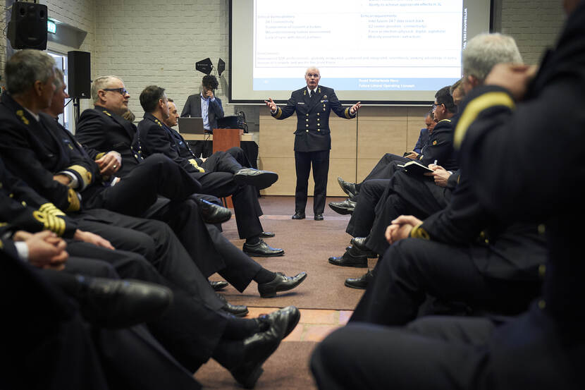 Kapitein ter zee Frank Lenssen durfde het aan om in zijn presentatie een beetje olie op het vuur te gooien. “We ontwerpen nu de iPhone 10, terwijl we in 2035 de iPhone 20 nodig hebben. We zouden slimmer naar de korte termijn moeten kijken.” Die korte termijn ligt volgens de chief of staff van NLMARFOR vooral op het vlak van het winnen van hearts & minds. “Willen wij als marine toekomst hebben, zullen we meer begrip en draagvlak moeten creëren voor nut en noodzaak van ons werk en specifiek ons operationeel product. Niet alleen bij de samenleving, maar ook binnen de andere operationele commando’s.”