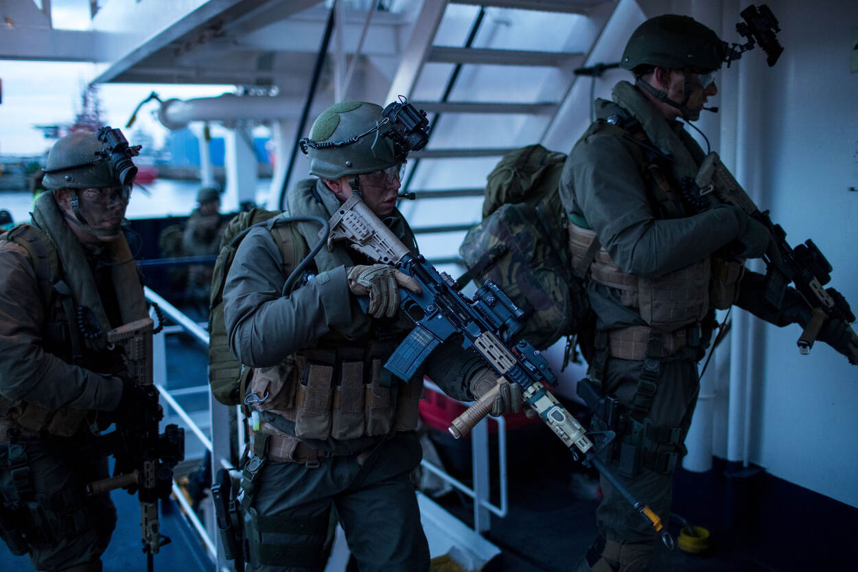 Nee, het zijn geen opnamen voor een film. Het is de certificeringsoefening van 21 Raiding Squadron. De militairen van het Korps Mariniers werkten hier al een jaar naar toe, tijdens zware bergtrainingen en oefeningen in ijskoude gebieden. En nu een scenario in Schotland, als ‘eindexamen’. De overheid van het fictieve land Pastonia roept internationale hulp in om wapensmokkelaars op te pakken en intel te verzamelen. Eerst op een vijandelijk schip, in de verlaten haven van Sunderland, daarna in 2 loodsen in Blyth.