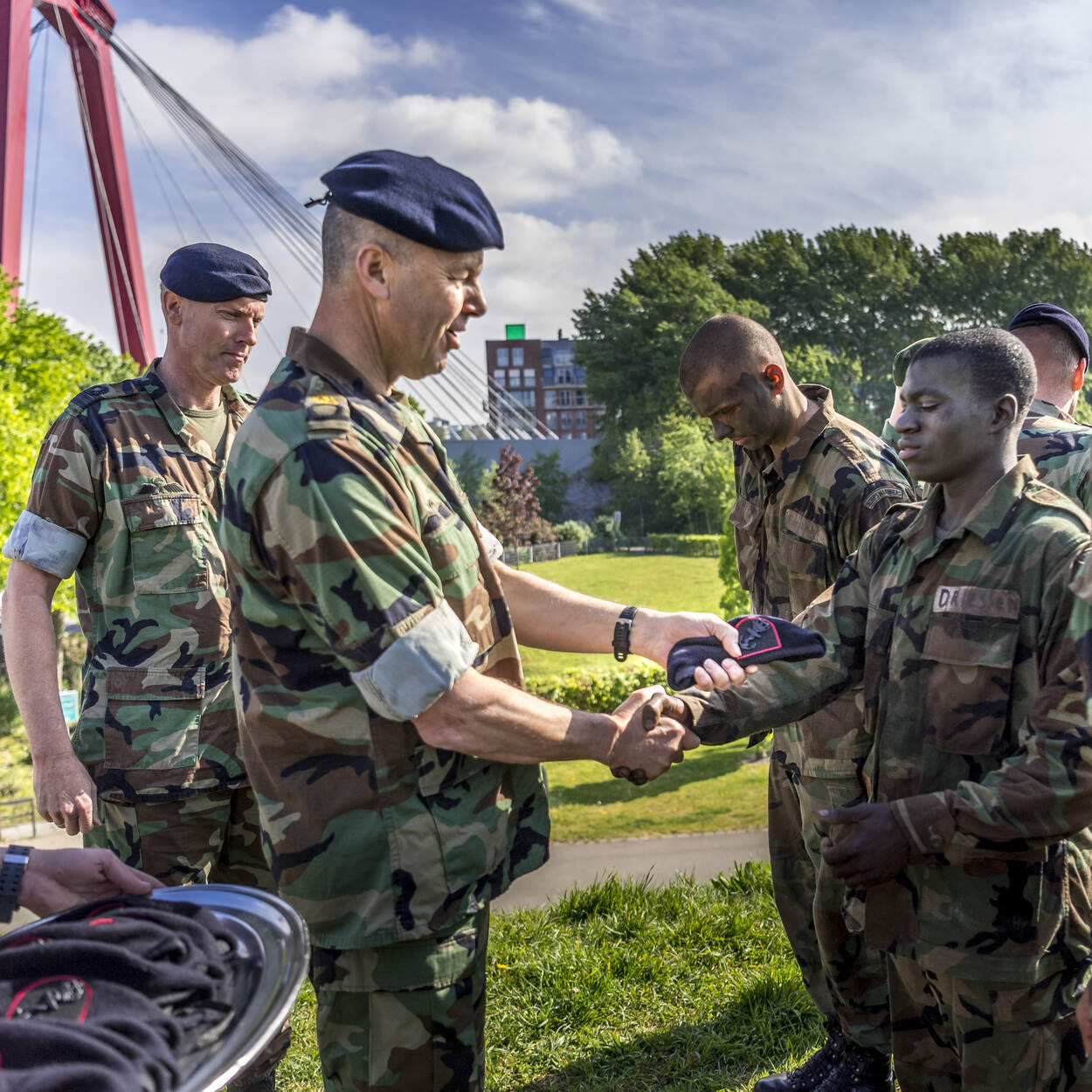 “Tijdens de EMV ligt de focus op persoonlijke vorming en het bijbrengen van individuele vaardigheden”, legt Maas uit. “De aansturing van kaderleden is dan strak en directief. Tijdens de EVO verschuift de aandacht naar het aanleren van vakinhoudelijke aspecten en het opereren binnen een sectie. De aansturing door kaderleden is hierbij veel meer gericht op coaching en begeleiding. De opleidingsbaret staat symbool voor de stap die mensen als persoon en militair maken, van de EMV naar de EVO. Door deze tussenstap verklein je ook de uiteindelijke afstand tussen de opleidingsfase en de plaatsing bij een operationele eenheid. Zelfstandigheid, initiatief en verantwoordelijkheid zijn dan namelijk al uitgebreid aan bod gekomen.”