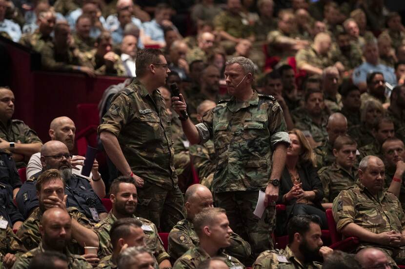 Naast bijgepraat worden, is ook je mening geven belangrijk, zoals ten overstaan van Commandant der Strijdkrachten LTADM Rob Bauer (met microfoon).