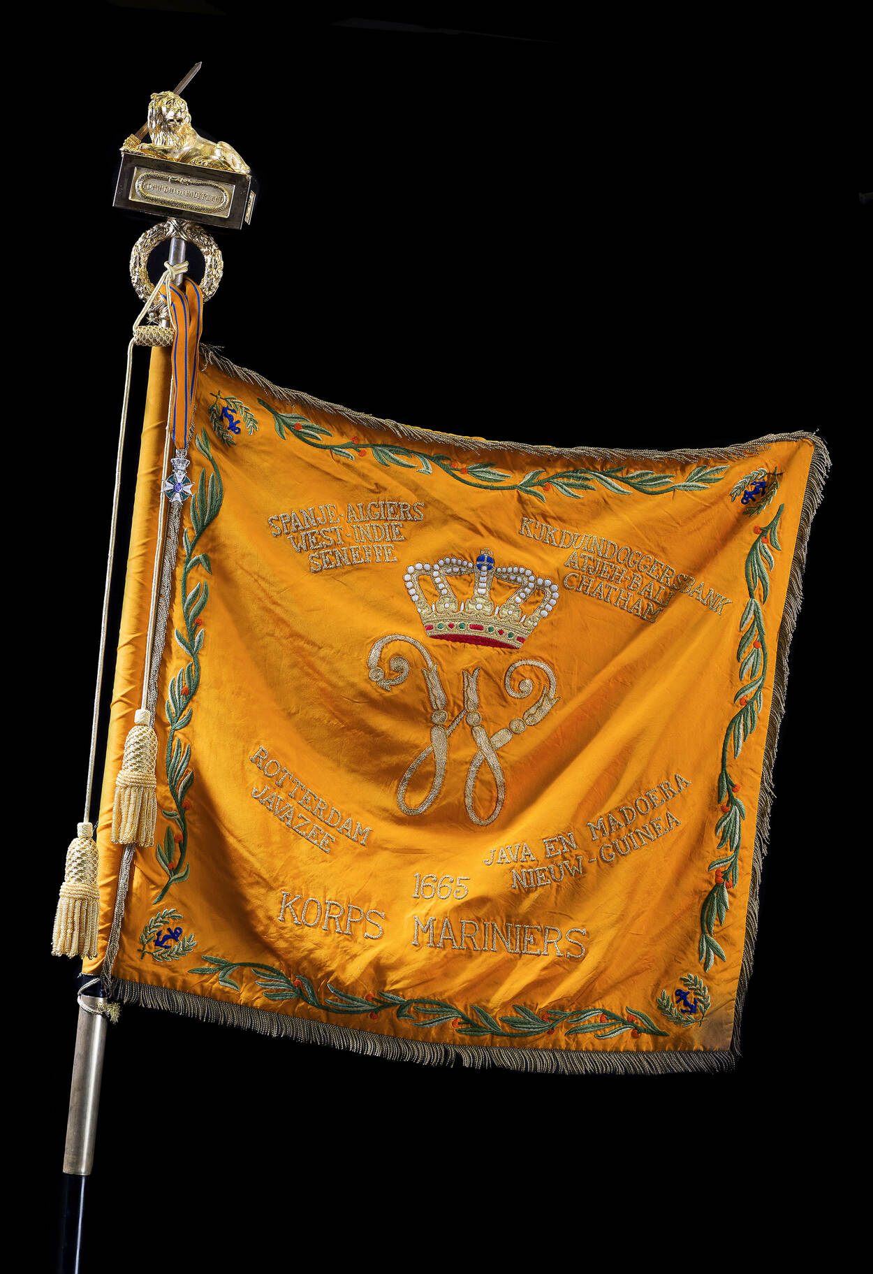 Kenmerkend voor het vaandel van het Korps Mariniers zijn 4 blauwe ankers in de hoeken en natuurlijk de (nu nog) 13 wapenfeiten.