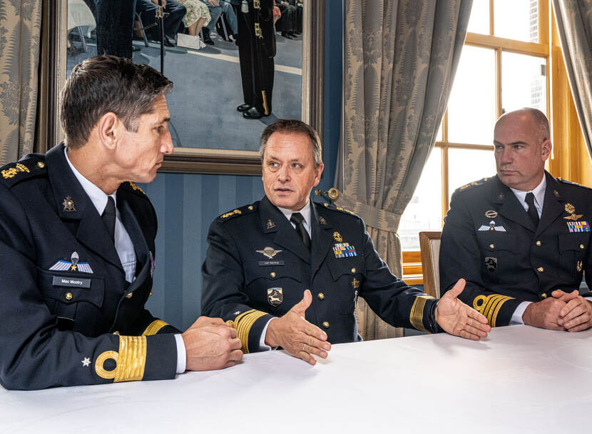 3 Mariniers die een rol spelen bij de toekenning van het nieuwe wapenfeit. In het midden generaal-majoor der mariniers Van Sprang. Als toenmalig korpscommandant diende hij de aanvraag in. De huidige korpscommandant brigadegeneraal der mariniers Mac Mootry (links) mag straks het vaandelopschrift (middels de cravatte) in ontvangst nemen. Kolonel der mariniers Rob de Wit schreef mee aan de Nota van Toelichting, een voor de toekenning onontbeerlijk document.