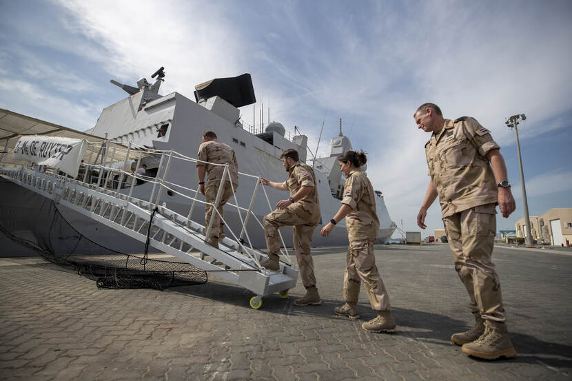 Tijdens de havenbezoeken in Abu Dhabi gaan de stafleden aan boord van Zr.Ms. De Ruyter.