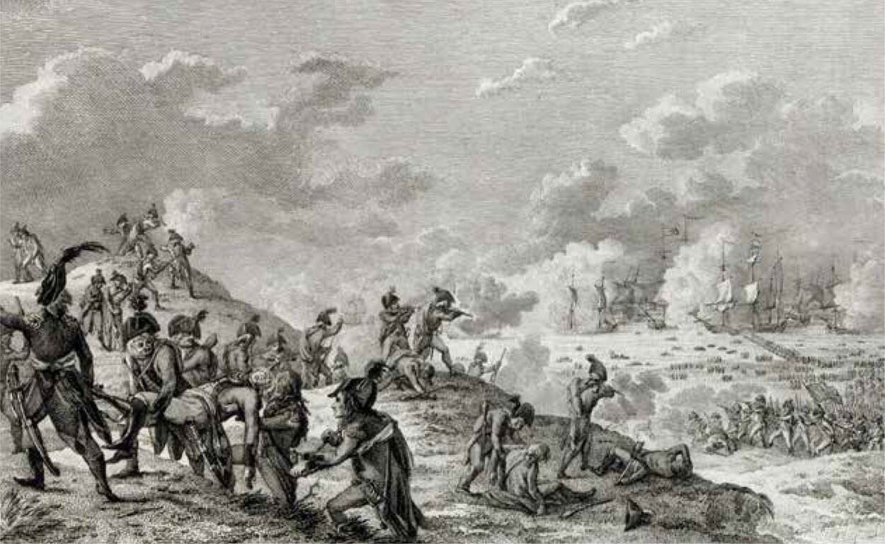 Landing van de Britten bij Callantsoog in 1799. Reinier Vinkeles (I.), naar Dirk Langendijk, 1800-1802. (Beeld: Rijksmuseum, Amsterdam)
