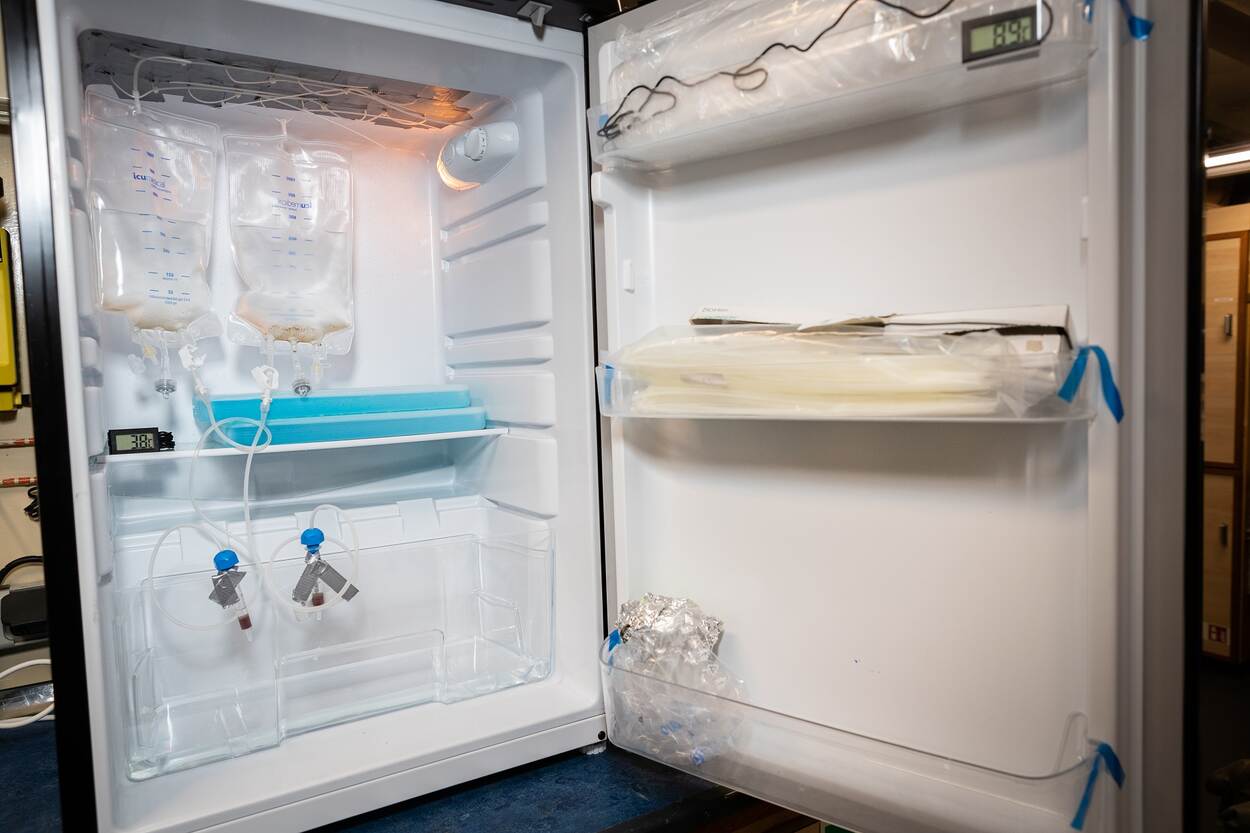De enige 2 niet militaire aanwezigen op de Cerberus en het baggerdepot zijn TNO-wetenschappers Arjan den Otter en Martin Olde. De eerstgenoemde zorgt ervoor dat de water- en bodemmonsters zo snel mogelijk de koelkast of vriezer in gaan of worden gefilterd. "Welkom in ons lab", grapt Den Otter bij 2 koelkasten op de Cerberus. "Het zeewater gaat in een infuuszakje en druppelt op een speciaal filtertje ter grootte van een vingerhoedje dat de stofjes tegenhoudt die we later in het laboratorium willen meten. We willen de situatie van onder water als het ware 'bevriezen'. Bij hogere temperaturen breken de stoffen vanzelf af en kun je ze niet meer meten. Voor de analyse op andere stoffen worden de monsters geconserveerd in een vrieskist, om ze later in een laboratorium te onderzoeken."