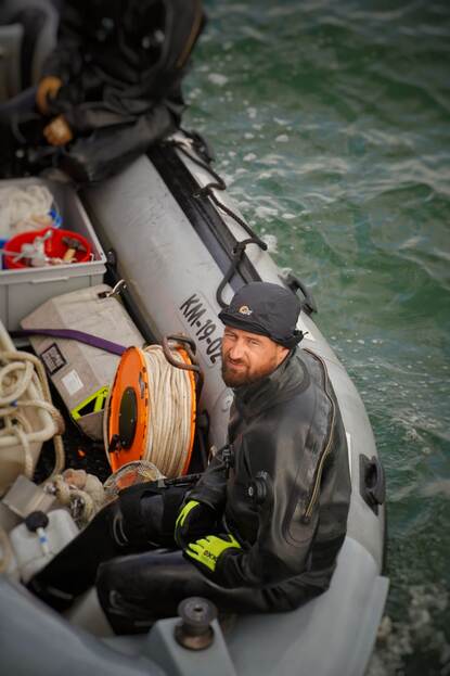 Het duikteam ging steeds met een rubberboot (LCRM) vanaf de Cerberus naar de duiklocatie. Eenmaal op de bodem hadden de EODD'ers nooit meer dan 1 meter zicht. "Op dieptes van ruim 30 meter hebben de duikers enkel wat licht van de lamp op het masker. Zodra ze op zoek gaan naar munitie en het slib komt los van de bodem, neemt het zicht snel af. Soms zelfs zo erg dat het werk op de tast uitgevoerd diende te worden. Onderwater lukten het de duikers toch de munitie te lokaliseren en, afhankelijk van het formaat en gewicht, werd een plan gemaakt hoe deze naar de oppervlakte te halen. De munitie werd in netten gedaan of met behulp van spanbanden en touwen aan boord van het vaartuig gehesen." De opdracht aan de EODD was om, als het even kon, 5 tot 6 stuks van elke soort munitie naar boven te halen. "Er ligt veel", weet kapitein Rick: "Van .50-kogels tot grote artilleriegranaten en antitankmijnen."