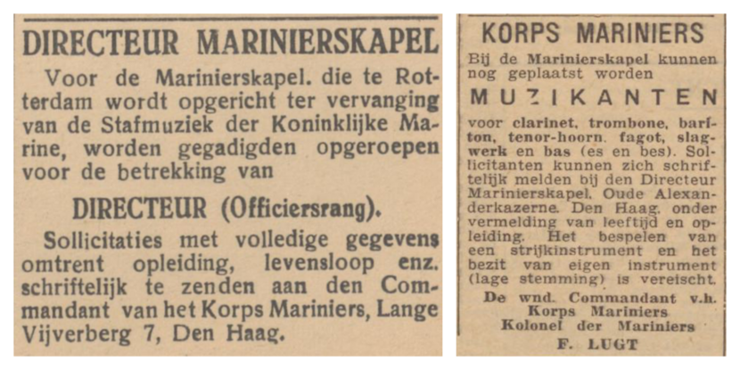 Advertenties voor muzikanten en een dirigent waren toen al verschenen in kranten en tijdschriften. Gijsbert Nieuwland werd op 22 oktober 1945 aangesteld als eerste dirigent, in de rang van, in eerste instantie, eerste luitenant der mariniers van Speciale Diensten. De eerste grote ceremoniële dienst onder zijn leiding was de Opening van de Staten Generaal, op 20 november 1945. Bij ceremonieel alleen bleef het niet, want al in december 1945 vond de eerste radio-opname plaats. Vanaf 1946 werden eerst maandelijks en daarna bijna wekelijks (live) radio-uitzendingen gemaakt; militaire muziek was namelijk ‘hot’ destijds.
