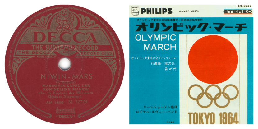 Links: de eerste 78-toerenplaat uit 1949. Rechts: de officiële muziek van de Olympische Spelen van Tokyo in 1964.