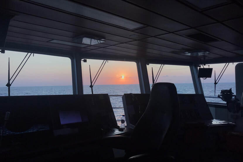 Zonsondergang gezien vanaf de vernieuwde brug van de Pelikaan. (Foto: Zr.Ms. Pelikaan)