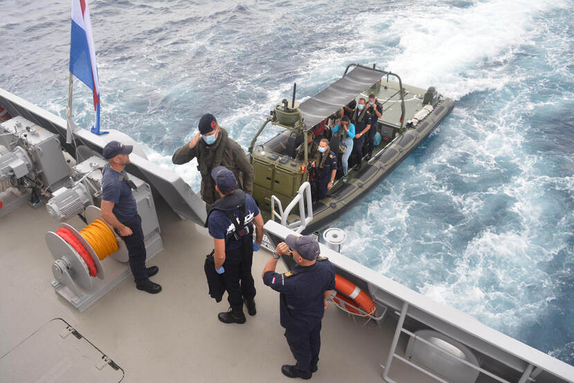 Het schip en de bemanning worden welkom geheten door een delegatie van de op Curaçao gelegerde mariniers.