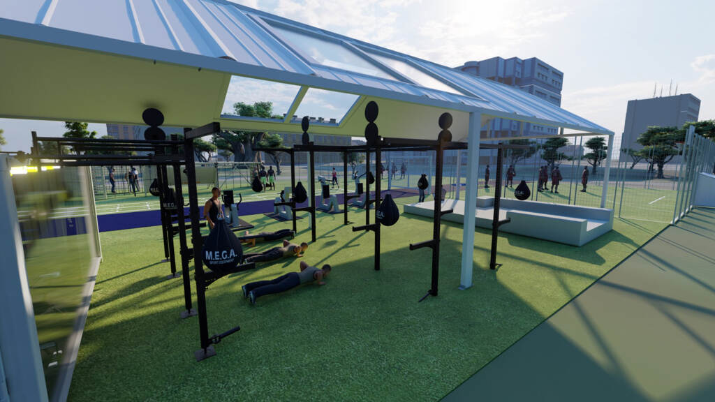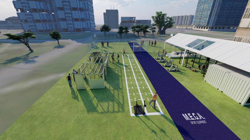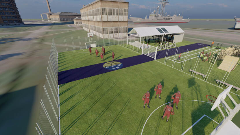 Het playcourt omvat ook een survival box met klimtouwen. Daarin kunnen eveneens functionele militaire trainingen worden ondernomen. In een overdekt gedeelte staat een zogeheten HITT-container voor krachttrainingen en hangen met water gevulde bokszakken. “Het is een divers complex waarop je bijna alle sporten kunt bedrijven”, vertelt initiatiefnemer majoor der mariniers Erwin Maarhuis, senior-adviseur van de staf Fysieke Training & Sport (FS&T) van het CZSK. Ook belangrijk: langs het court komt een soort ‘hangplek’ voor toeschouwers. “Hopelijk stimuleert dit mensen die komen kijken om ook te gaan sporten”, legt Maarhuis uit.