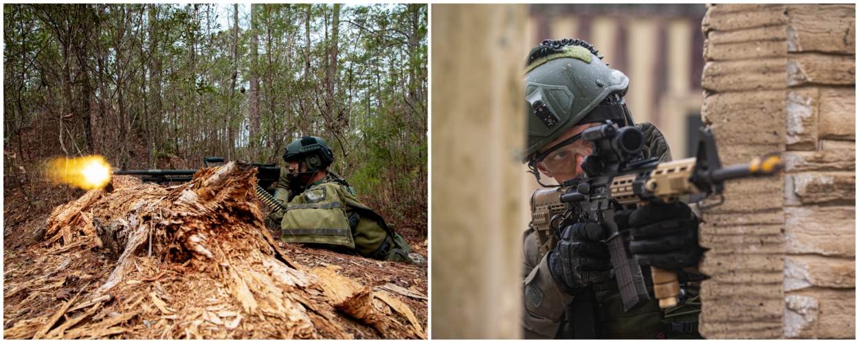 Wel met scherp werd geschoten in het Shooting House, waar de mariniers, geregeld in het halfduister, levensgroot afgebeelde tegenstanders te ‘lijf’ gingen. Amerikaanse snipers en schutters lange afstand van MSC hadden hun eigen doelen te verwezenlijken en beoefenden hun skills op enkele van de vele schietbanen van Camp Lejeune.
