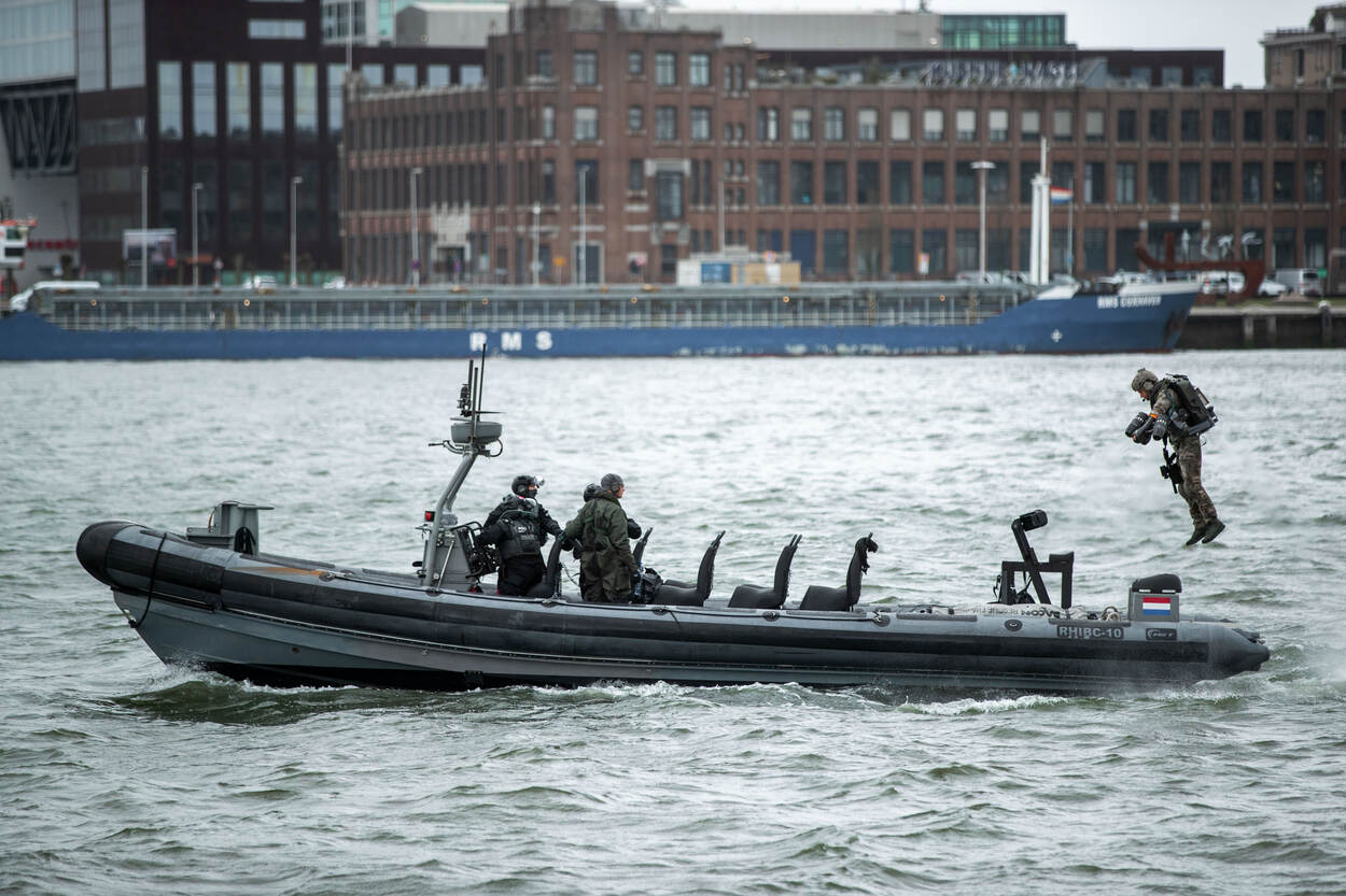 Het harnas met straalmotoren zorgt voor een groot verrassingseffect. “Je hoort ‘m wel, maar voor je iemand ziet aankomen, staat hij al naast je”, vertelt een operatieofficier van de Netherlands Maritime Special Operations Forces (NLMARSOF), die om vanzelfsprekende redenen anoniem blijft.