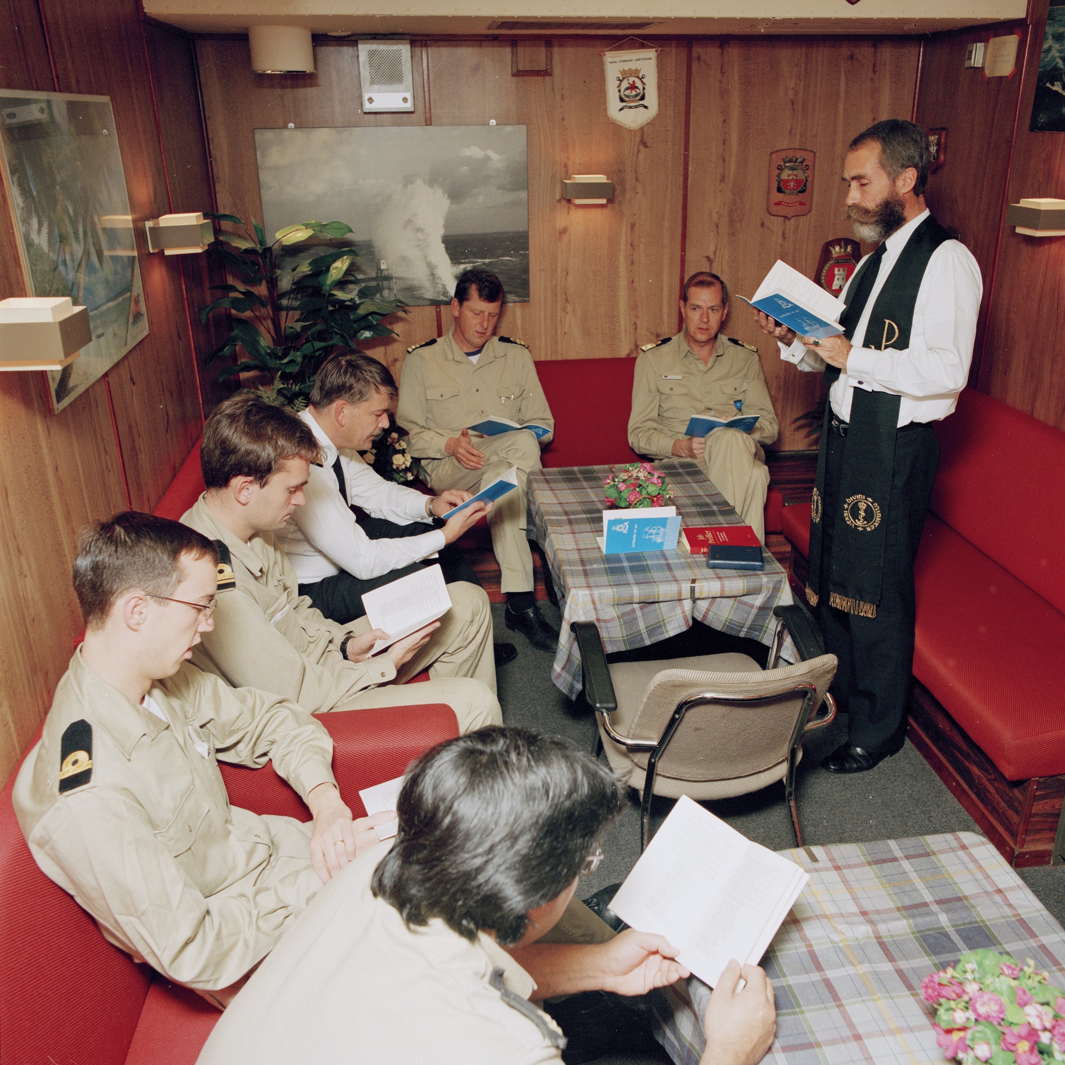 Op 20 mei 1921 wordt het ambt van vlootpredikant en vlootaalmoezenier bij Koninklijk Besluit ingesteld. Koningin Wilhelmina gaf de geestelijk verzorgers de opdracht mee om ‘onze eigen mensen te beschermen tegen de gevaren van de boze buitenwereld’. “Volgens mij hebben onze mensen nu eerder zin in die buitenwereld”, grinnikt Hoofd Geestelijke Verzorging CZSK Fred Omvlee, sinds 2002 vlootpredikant bij de marine. “Men stuurde destijds een dominee of pater mee om de boel een beetje in het gareel te houden; om te voorkomen dat de bemanningsleden zich aan uitspattingen te buiten gingen”, aldus Omvlee. “In die zin is dat ook wel iets van alle tijden”, knipoogt hij.