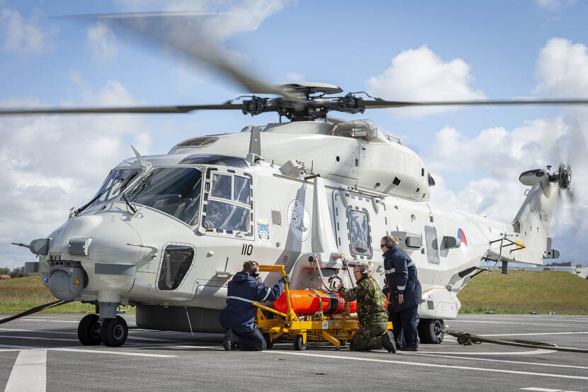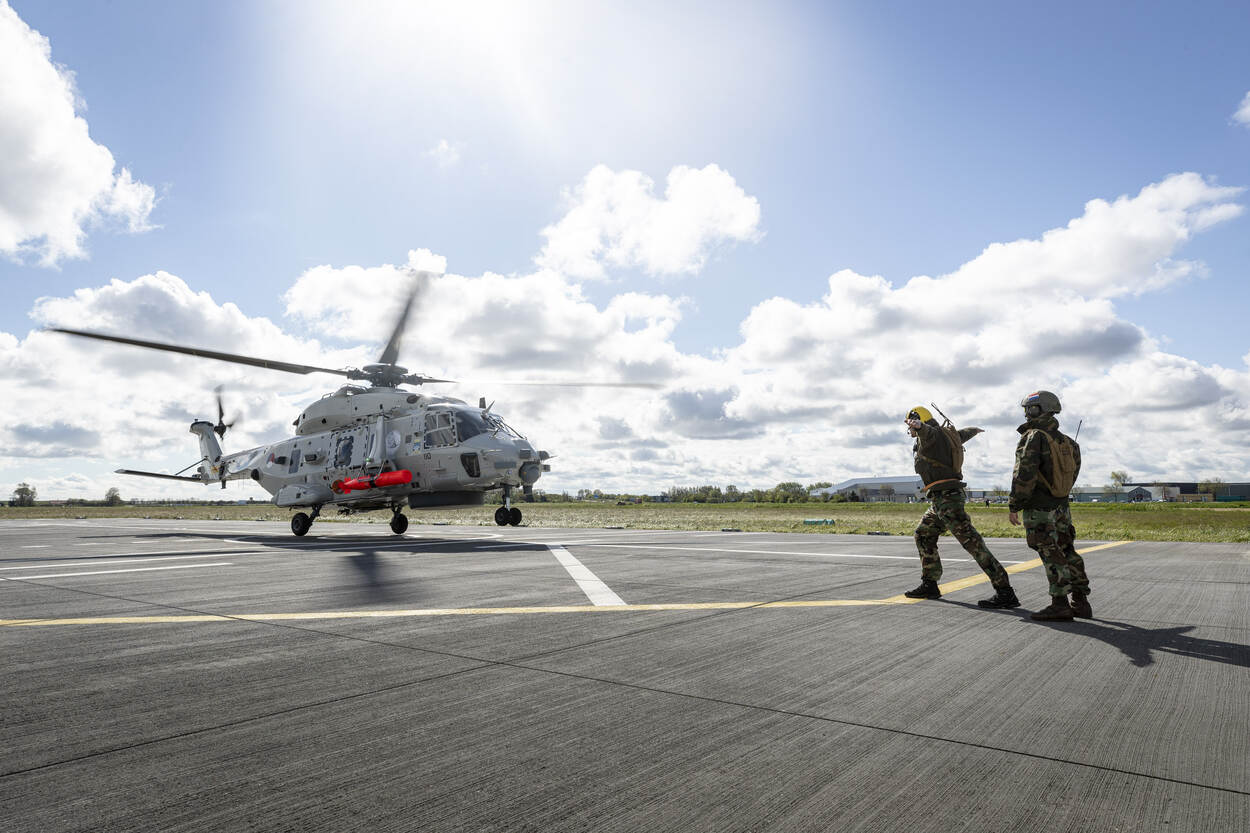 En weg! Een NH90 vliegt even ‘om de hoek’ om zijn bewapening af te werpen.