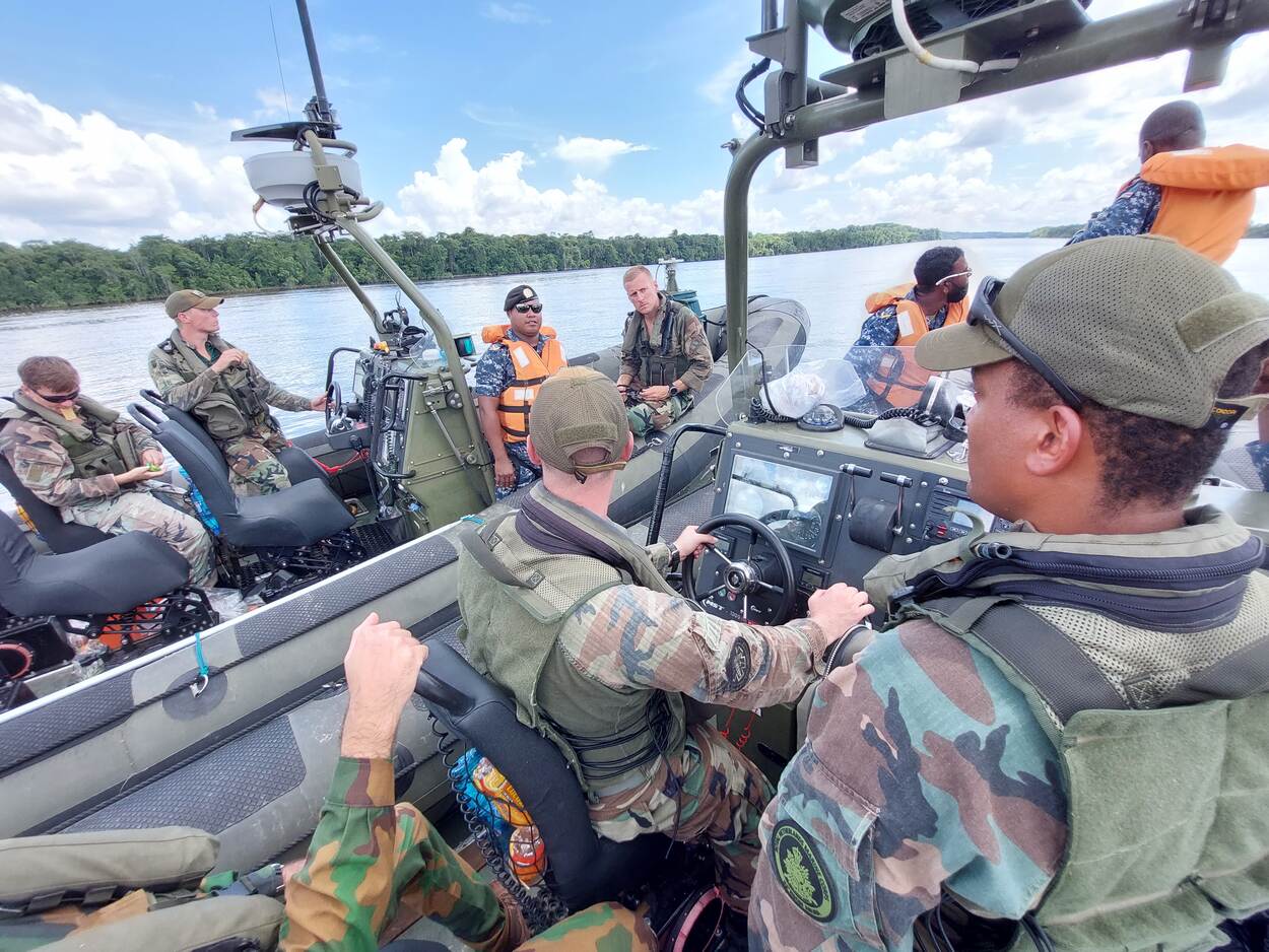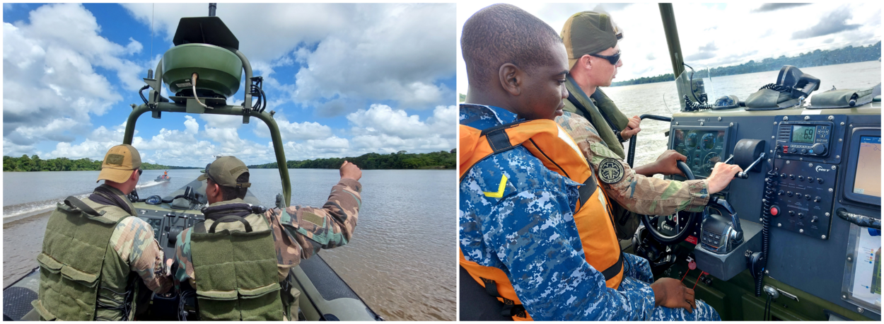 Heldere taal van de marinier van de Bootgroep van 32 Raiding Squadron. De navigator van de snelle FRISC bevindt zich midden op de Suriname Rivier, naast een tweede FRISC. Op hun vaartuigen vaart een delegatie van Surinaamse marine-infanteristen mee. Het kleine vlootverband wordt aangevuld met 1 sloep van de Surinaamse Marine, alsook 1 bootje van de Surinaamse Kustwacht. Het is het beeld van een hernieuwde kennismaking tussen beide krijgsmachten.
