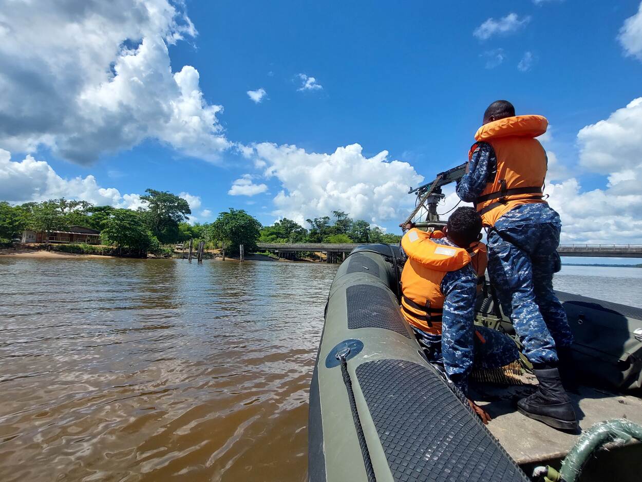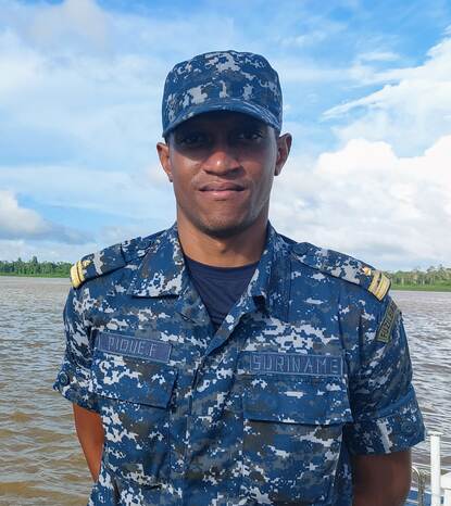 De Suriname Rivier is de uitvalsbasis van het Korps Mariniers Suriname, vertelt pelotonscommandant eerste-luitenant Pique, terwijl hij als passagier op een FRISC over de rivier scheert. “We zijn hier regelmatig te vinden. Maar boten als de FRISC’s zul je bij ons niet vinden. Wij hebben enkel kleinere patrouilleboten. Onze eenheid is nog heel jong; we zijn opgericht in 2017 en bestaan uit 3 pelotons. We voeren patrouilles uit, maar het ondersteunen van de politiedienst is ook een van onze taken. Zo patrouilleerden we in de straten tijdens de lockdown vanwege corona.”