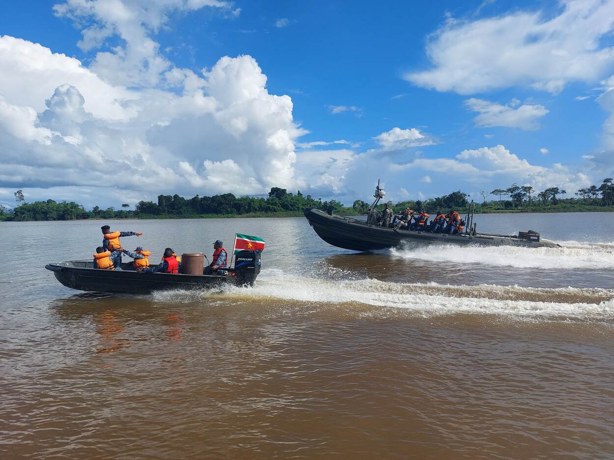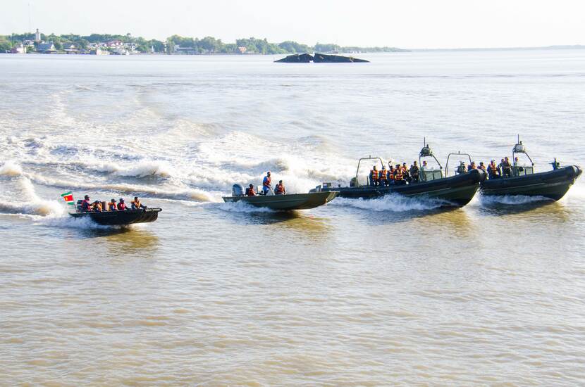 Het Korps Mariniers, het Surinaams Nationaal Leger en de Surinaamse Kustwacht samen te water.