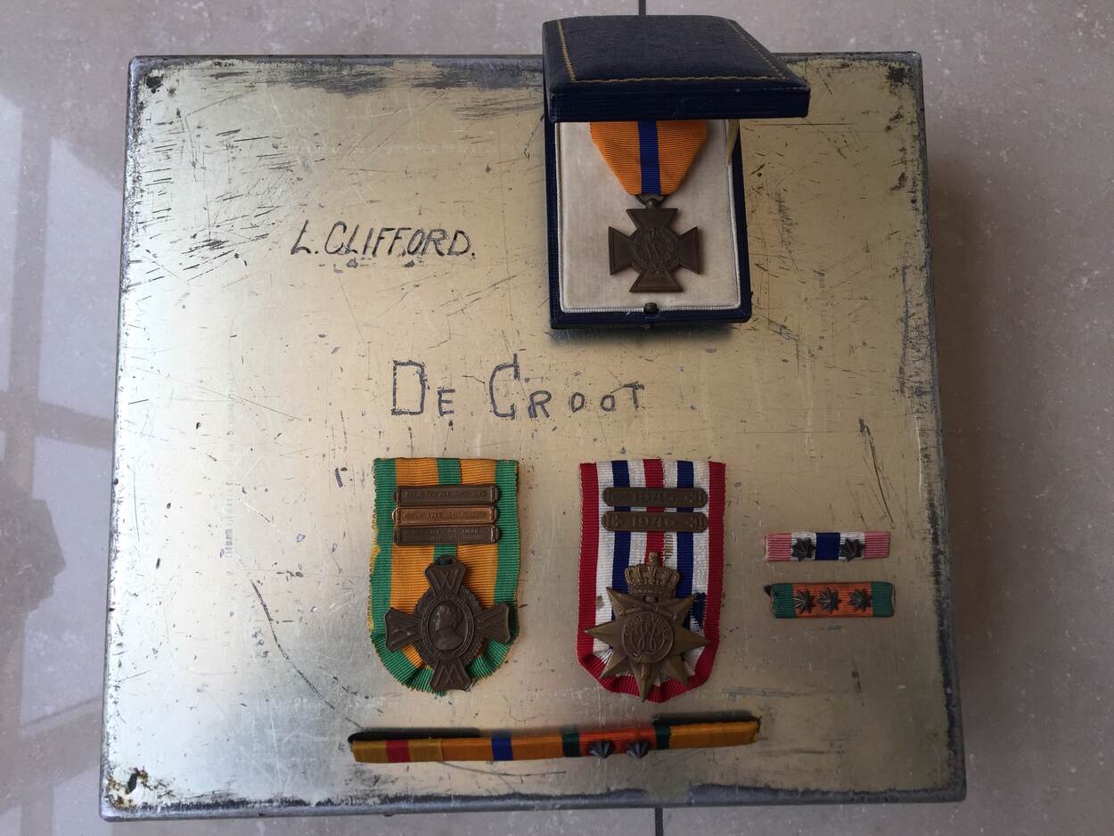Zeer wel mogelijk dat korporaal-torpedomaker L. Clifford bij die gelegenheid het in de intro genoemde aluminium kistje als afscheidsgeschenk aan De Groot overhandigt. In de deksel van het kistje staat namelijk met sierlijke letters ‘L. Clifford’ gekrast. De voorzijde verraadt dat het (blijkbaar van oorsprong Duitse) kistje eens een Fahrtmessanlage bevat heeft, een instrument om het aantal knopen dat een schip vaart te meten.