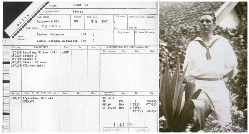 Pieter de Groot wordt op 15 augustus 1904 in Dordrecht geboren. Je kunt niet zeggen dat het leven hem meteen toelacht. Zijn vader komt nog datzelfde jaar te overlijden. Als hij 15 jaar oud is, gaat ook zijn moeder dood. Pieter kiest voor de zee en op 15 april 1921 meldt de 16 jarige zich aan bij de marine, als leerling-stoker. Hij wordt in eerste instantie geplaatst op Hr.Ms. Van Speijk, een oud stoomschroefschip dat dienstdoet als logementsvaartuig in het Nieuwe Diep. In 1924 volgt de overstap naar de Onderzeedienst, inmiddels in de rang van stoker eerste klas. De Groot heeft zich inmiddels op vrijersvoeten begeven en trouwt in datzelfde jaar met Trijntje de Croos.