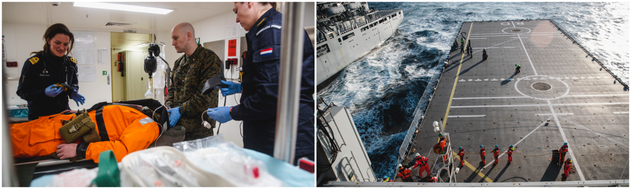 Aan boord van de Rotterdam beoefende de bemanning ook de afvoerketen van de gewondenverzorging. Per helikopter werden oefengewonden ijlings van land naar het schip afgevoerd en opgevangen. Tegelijkertijd draaide uiteraard ook de dagelijkse bedrijfsvoering gewoon door. Zo kreeg het schip de nodige voorraden aangereikt door de Duitse FGS Berlin (A1411).