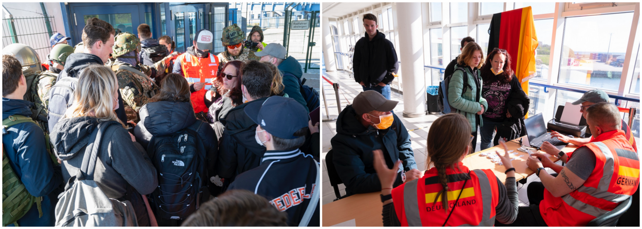 “Ons neefje was bij ons aan het spelen, dus ik heb hem meegenomen”, vertelt een huilende moeder aan een marinier van de Duitse Küsteneinsatzkompanie (KEK) in de haven van Mukran, Oost-Duitsland. Hij moet het moeilijke besluit nemen wie aan boord van Zr.Ms. Rotterdam komt en wie achterblijft. Het jochie staat niet op de lijst en heeft geen paspoort bij zich. “We zijn niet veilig en moeten zo snel mogelijk mee met het schip”, smeekt de moeder nogmaals. Nadat dan toch de hele familie is geregistreerd, volgt een wachtrij naar de rubberbootjes die hen naar het Nederlandse schip zal brengen. “Alweer een rij”, verzucht ze.