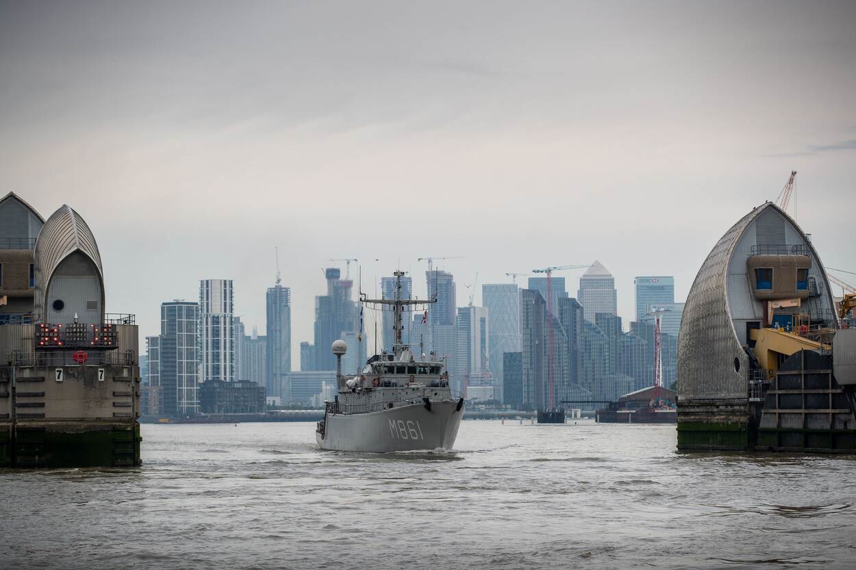 Zr.Ms. Urk manoeuvreert het havengebied van Londen uit. (Foto: SGTBDAV Jasper Verolme)