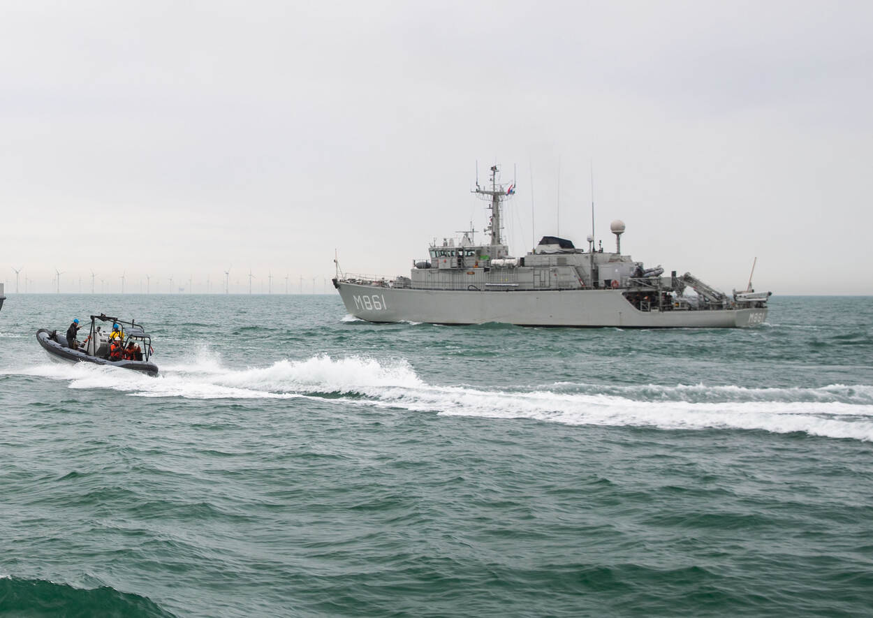 Personeel van de Mijnendienst in actie op volle zee.