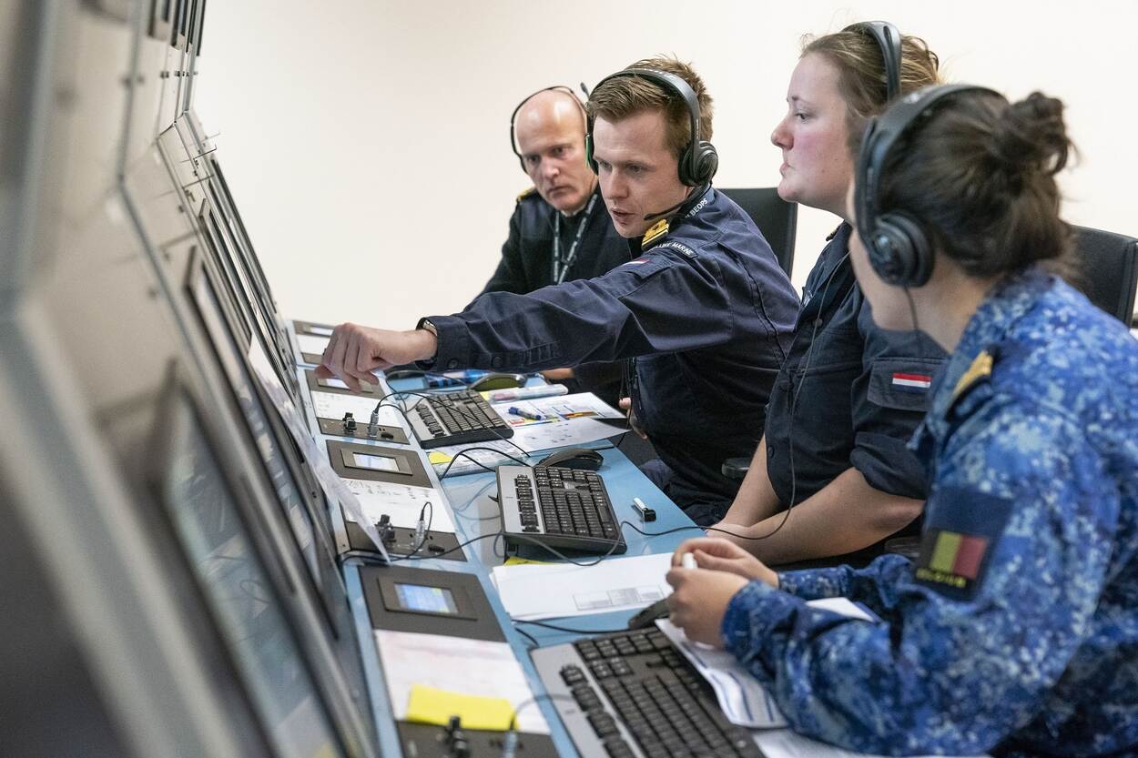 De opleiding, waaraan ook Belgen en Duitsers meedoen, is pittig en duurt liefst een jaar. Bepaald geen ‘cursusje’ dat je er op een paar regenachtige middagen doorheen jast. In de eerste 6 maanden krijgen de deelnemers stapels theorie voorgeschoteld, meestal zittend achter een PC-scherm gekoppeld aan een generiek combat management-systeem. Daarna werken ze in een nagebootste commandocentrale, een trainer. “We leiden de cursisten op voor operaties in het hoogste geweldspectrum. Als een marineschip een Russische onderzeeboot met kwade bedoelingen tegenkomt, moet de commandocentrale-officier precies weten wat hij moet doen. De opleiding is net écht, behalve dat je niet vaart.”