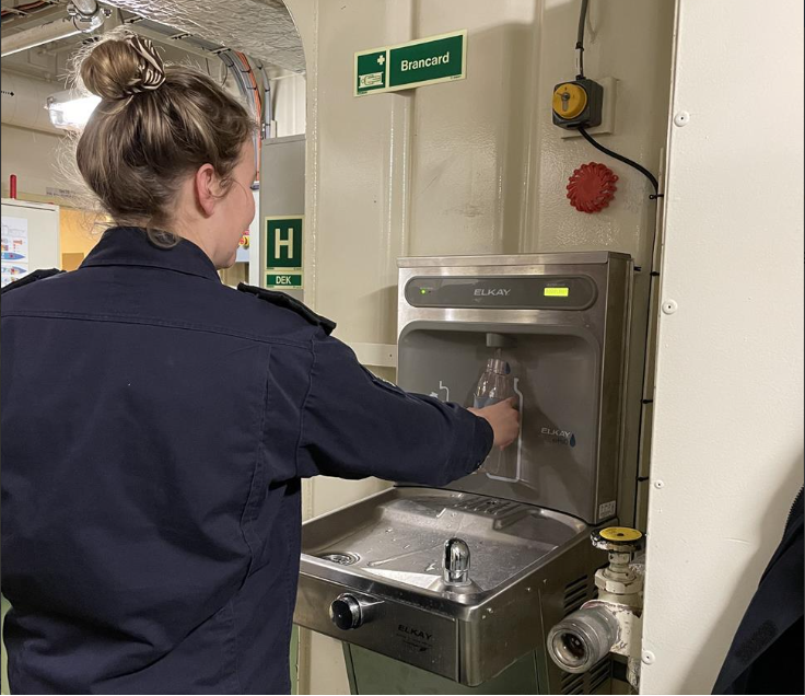 Degenen die varen weten het. Wij maken aan boord van de schepen zelf drinkwater van zeewater. Dat wordt via vele meters drinkwaterleiding naar alle tappunten en waterkoelers gebracht. Met de huidige waterkoelers was het al mogelijk om water aan boord uit de kraan te drinken. Toch worden er nog steeds heel veel plastic wegwerpflesjes water uit de koeling gepakt.