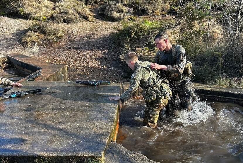 “Eerst nog een intensief 9-daags bivak vooraf, met veel actie en weinig slaap. Wel konden we daarna 1 nacht op de kazerne slapen. Daarna begon het. Als eerste kregen we de Endurance Course, 9 mijl compleet omgehangen verplaatsen door het drassige terrein en bijvoorbeeld ook door ondergelopen tunnels ‘kruipen’. Dan is het een kwestie van je adem inhouden, terwijl je collega jou met wapen er doorheen duwt. Bij terugkomst op de kazerne was er meteen een schietoefening, om te kijken of je na alle inspanningen nog wel de rust en de precisie had om goed gericht te kunnen vuren.”
