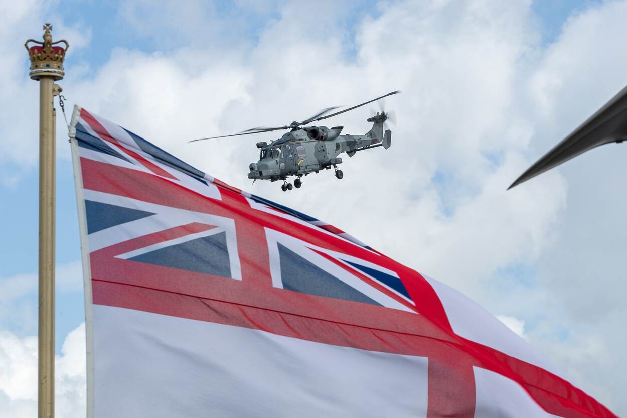 Een Britse boordheli en de fraaie ‘White Ensign’ van de ‘Royal Navy’ in één beeld gevangen. (Foto: SM Cristian Schrik)