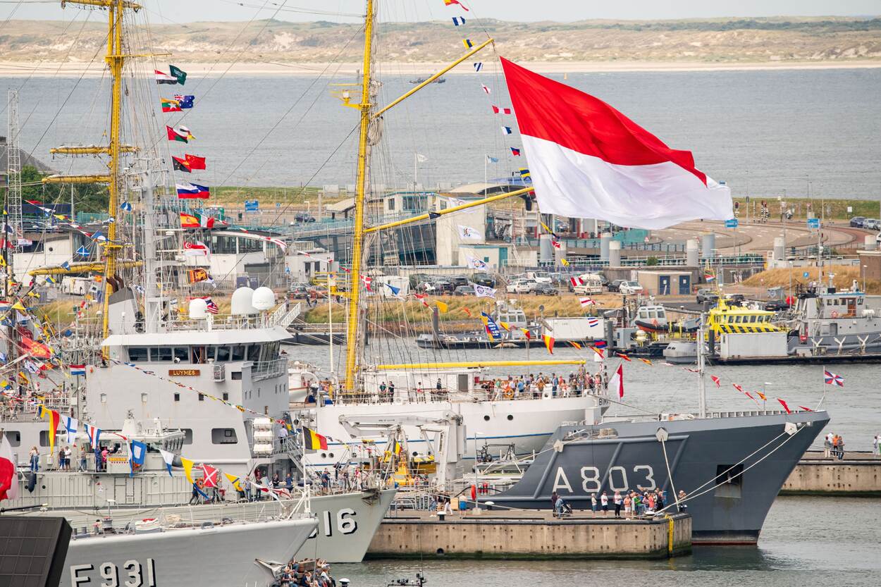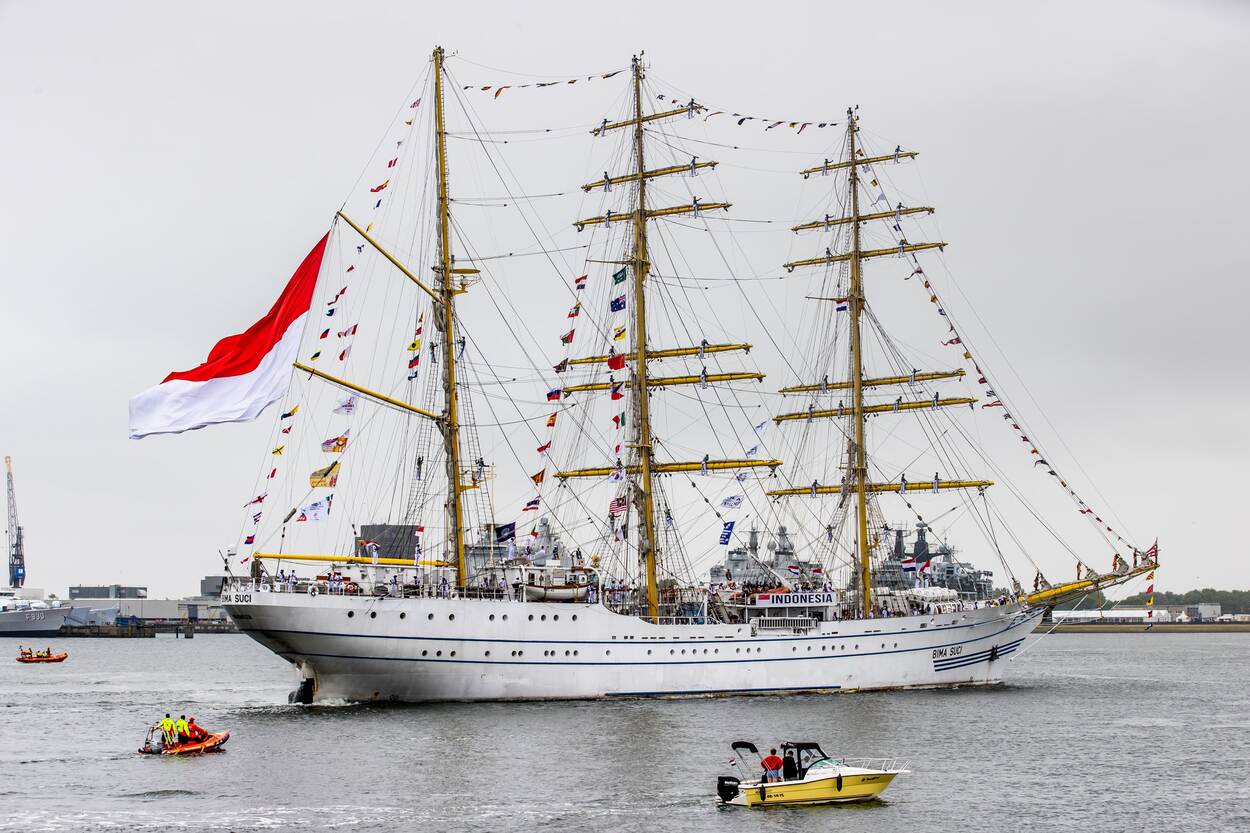 Onmiskenbaar was de Indonesische vlag van de driemaster Bima Suci. De zichtbare boegnummers zijn van het hydrografisch opnemingsvaartuig Zr.Ms. Luymes (A803) en 2 Belgische schepen: de mijnenjager Bellis (M916) en het M-fregat Louise Marie (F931). (Foto: Keesnan Dogger)