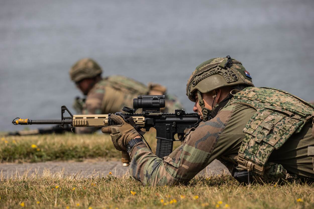 Een ‘Royal Marine Commando’ vuurt op een imaginaire vijand tijdens de amfibische landing van het Korps Mariniers. (Foto: SM Cristian Schrik)