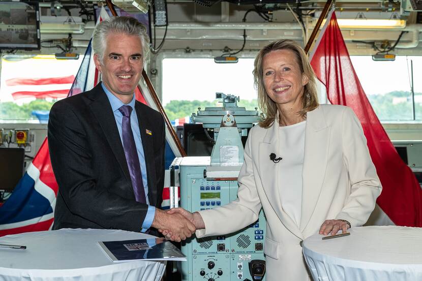 Nederland en het Verenigd Koninkrijk gaan het komende jaar de mogelijkheid onderzoeken om samen te werken bij de aanschaf van nieuwe marineschepen. Daarvoor ondertekenden (inmiddels demissionair) Defensieminister Kajsa Ollongren en haar Britse collega James Cartlidge een verklaring tijdens de Marinedagen. Beide landen willen in het volgende decennium een aantal schepen vervangen door een nieuw type. Het gaat voor Nederland om 1 scheepsklasse, waarvoor de beide Landing Platform Docks en de 4 OceanGoing Patrol Vessels plaatsmaken. De nieuwe schepen moeten rond 2035 klaar zijn. Tevens ondertekenden de bewindslieden een verklaring waarin zij de samenwerking binnen de UK/NL Amphibious Force voor de komende jaren vastlegden. (Foto: SM Cristian Schrik)