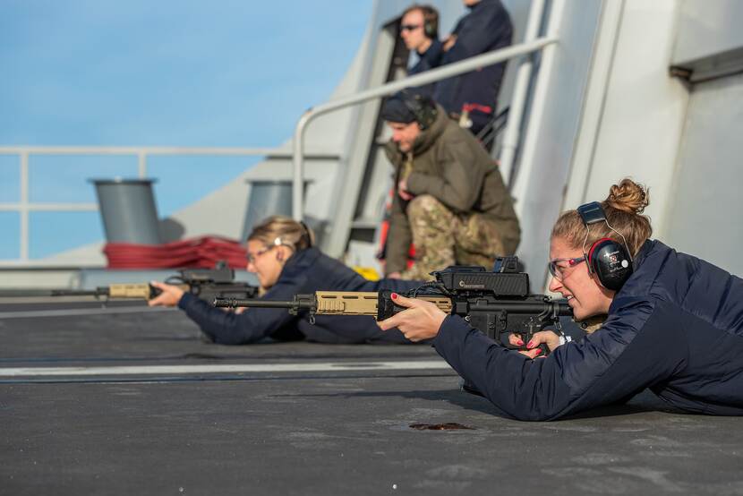 Alhoewel de oefening aan boord van een marineschip is en het doel is om juist schepen weerbaar te maken tegen de dreiging van drones, is er toch sprake van multidisciplinaire samenwerking, legt Joep uit. “Ik leen systemen en mankracht van de luchtmacht en de sectie Force Protection van de Brigade Speciale Beveiligingsopdrachten (BSB) van de marechaussee heeft luchtvaartwaarnemingspullen en ook personeel geleverd. De BSB’ers werken samen met instructeurs van het Joint Kenniscentrum Schieten van de landmacht en mensen van het Mariniers Opleidingscentrum.”