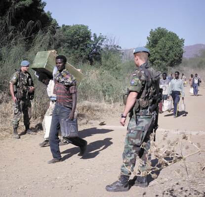 De Veiligheidsraad besloot tot oprichting van de United Nations Mission in Ethiopia and Eritrea (UNMEE). De Stand-by Forces High Readiness Brigade (SHIRBRIG) van de VN leverde het hoofdkwartier en een deel van de 4.200 militairen. Van Gils: “De militaire component stond onder leiding van de force commander, generaal-majoor der mariniers Patrick Cammaert. De generaal kreeg onder andere de beschikking over het 2e Mariniersbataljon. Dit was op weg naar de NAVO-oefening Destined Glory in de Middellandse Zee, maar werd in allerijl geretasked richting UNMEE.” Hr.Ms. Rotterdam, met 4 Lynx-boordhelikopters, transporteerde het geheel naar Oost-Afrika.