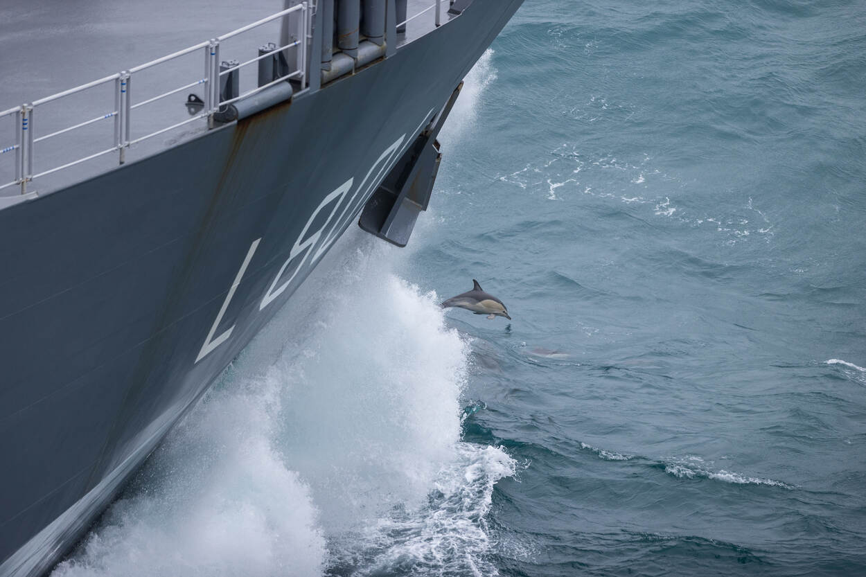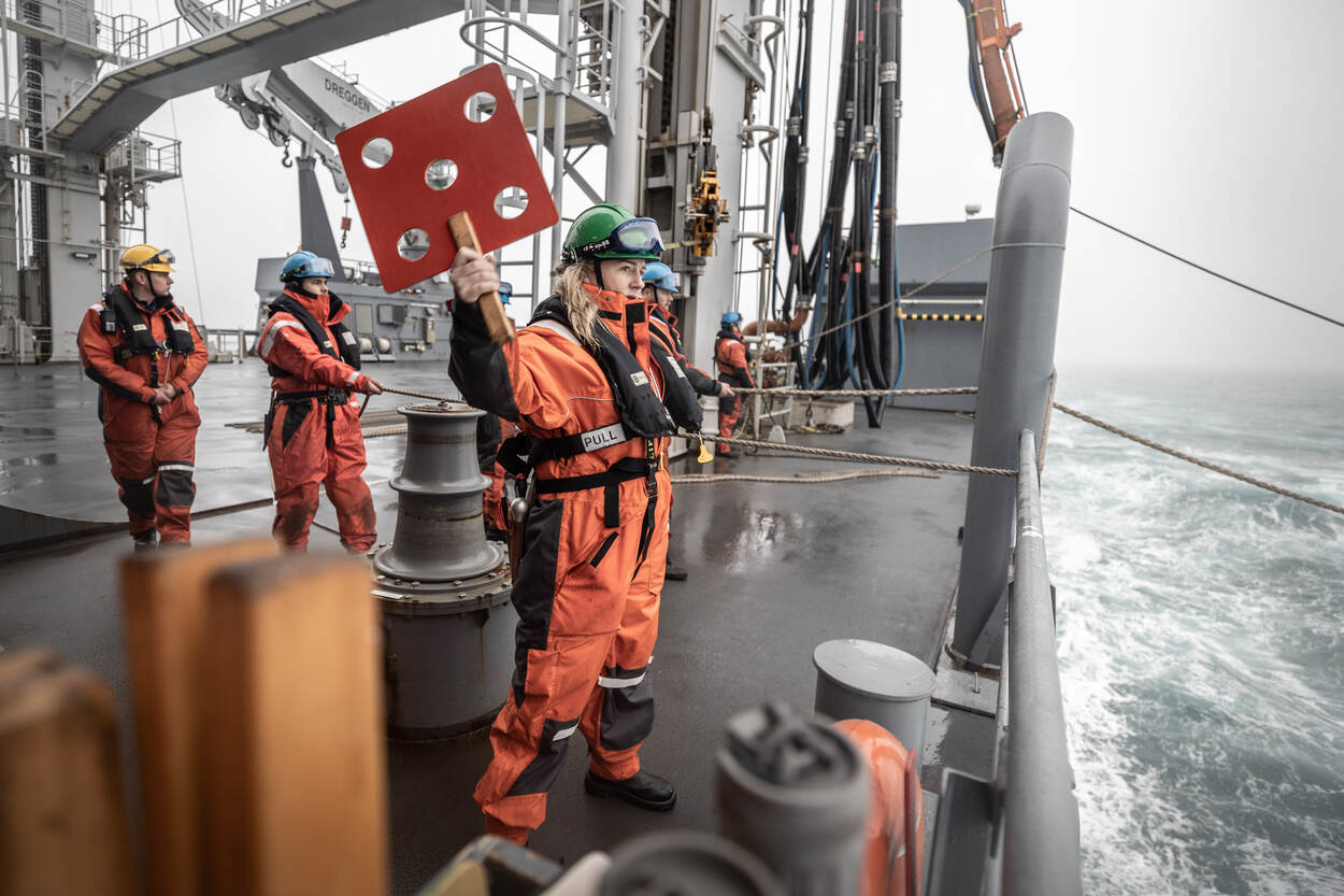 Onder de grijze lucht duikt in de verte het amfibische transportschip op. Steeds wordt het stipje wat groter, tot het punt dat de schepen op zo’n 42 meter van elkaar vandaan varen. Een spectaculair gezicht volgt. Terwijl de golven tegen de scheepshuiden klotsen, krijgen de dekploegen op beide schepen het uiteindelijk voor elkaar om de eerste lijnen over te schieten, op een ruwe zee, dicht naast elkaar varend. De bemanningen slagen erin om in korte tijd ruim 250.000 liter brandstof over te laden. Onder de toeschouwers klinkt een vergelijkbaar geluid als een dag eerder: “Het blijft mooi om te zien”.