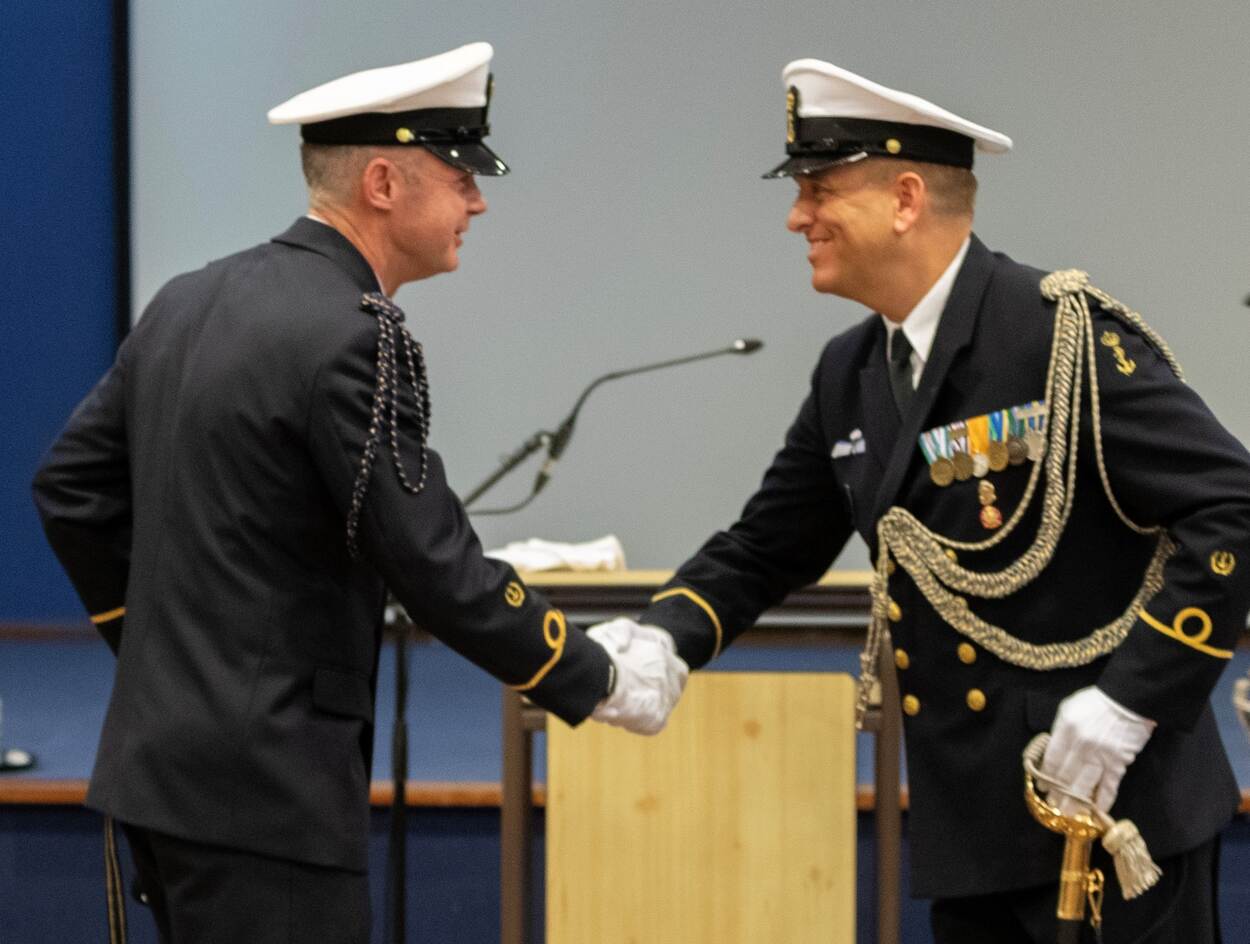 Ze kennen elkaar al jaren. Begonnen hun loopbaan bij de mariniers. En hadden hun eerste plaatsing aan boord van de stoombevoorrader Hr.Ms. Poolster. Onlangs passte de een de hoogste onderofficierspost binnen de Koninklijke Marine door naar de ander. In Den Helder gaf Chef d’Equipage CZSK adjudant ODOPS Hans Hijman in Den Helder zijn functie over aan adjudant ODND René Heeringa.