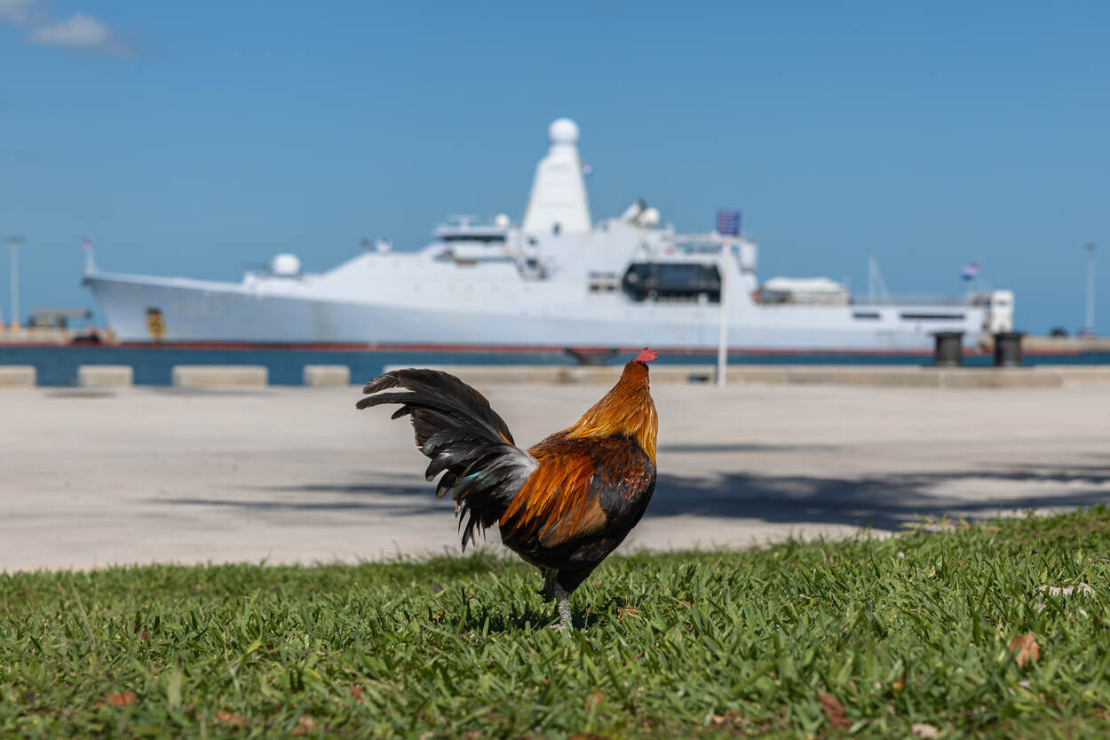 In de haven van Key West verdwijnt de zon inmiddels achter de horizon. Ook de jubileumdag nadert daarmee zijn einde. En hoe belangrijk de samenwerking is, bleek uren eerder nog maar eens, toen commandeur Hansen een bericht op zijn telefoon kreeg: “Weer een go fast onderschept bij Aruba. Details volgen.”