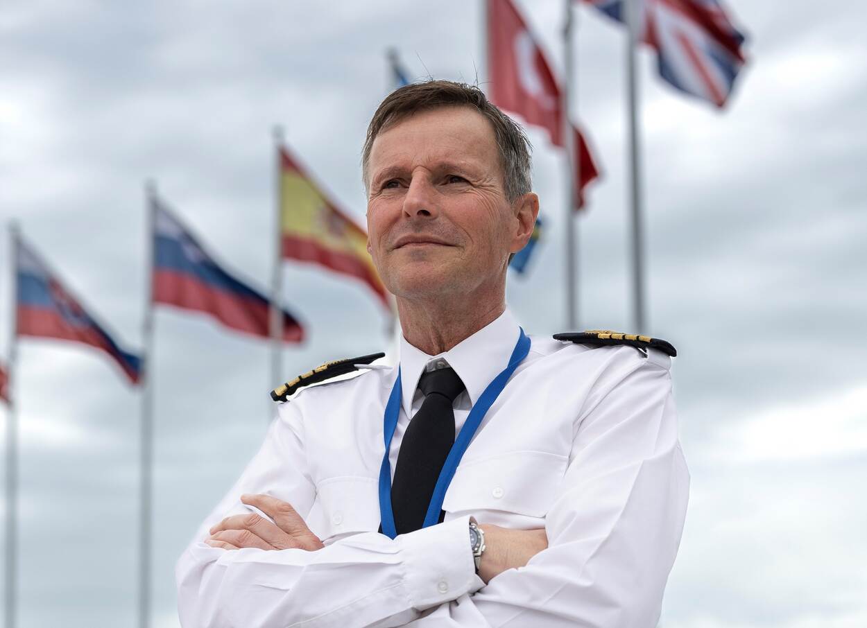 Kapiten ter zee Hans Veken met vlaggen van NAVO-lidstaten op de achtergrond.