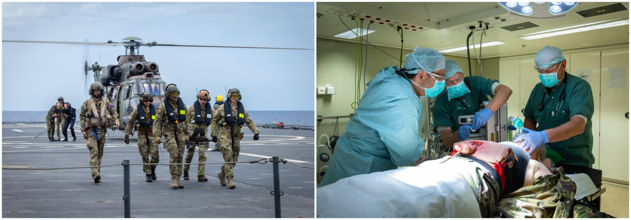 “Dit is onze grootste maritieme Role 2-inzet ooit. De Karel Doorman heeft vergeleken met andere marineschepen een enorm medisch complex. Wat dat betreft worden we ontzettend verwend. We beschikken over 4 Spoedeisende Hulp (SEH)-bedden, 2 operatiekamers en 15 verpleegbedden, waarvan 5 voor intensive care (IC). Daarnaast hebben we de mogelijkheid om röntgenfoto’s te maken.”