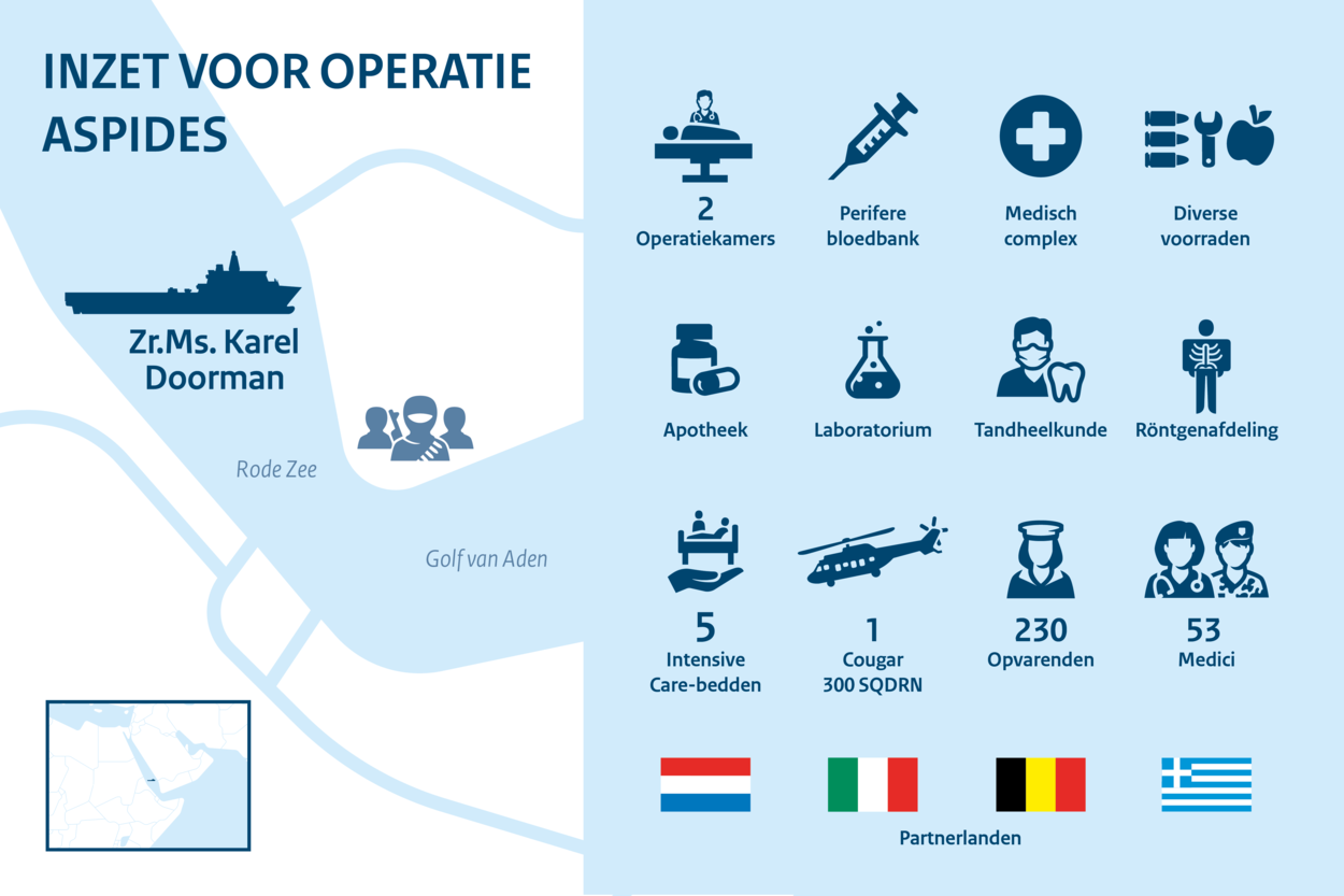 Met de deelname aan Operatie Aspides draagt Nederland bij aan het handhaven van vrije doorvaart door de Rode Zee. Dit is een cruciale route tussen het Suezkanaal en de Indische Oceaan. Houthi-rebellen uit Jemen vallen er geregeld koopvaardijschepen aan met raketten en drones. Zr.Ms. Karel Doorman is in de Rode Zee aanwezig om de marineschepen die deze koopvaarders begeleiden te voorzien van brandstof en indien nodig medische capaciteit.